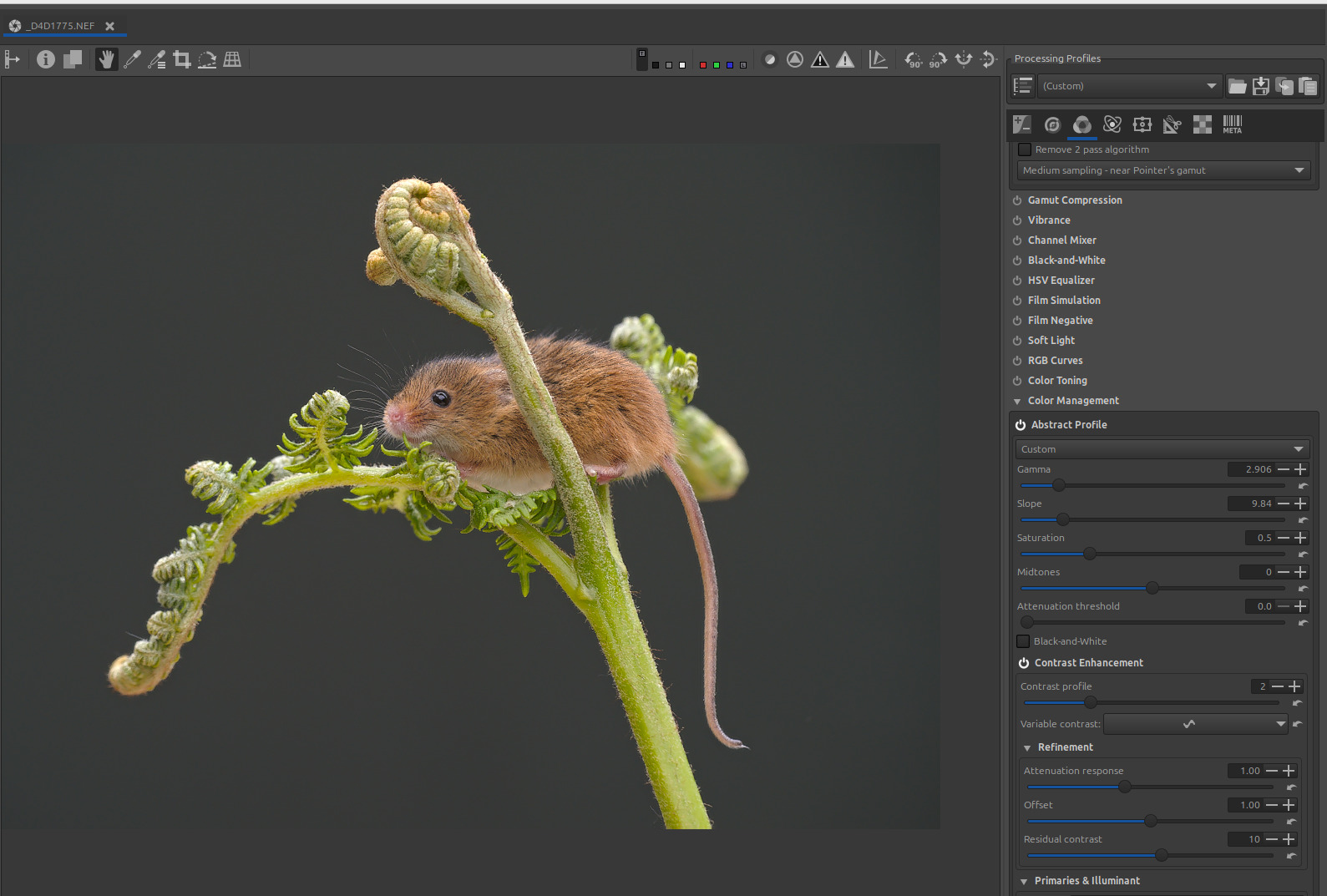 The major problem – not specific to this tool but generally due to RawTherapee’s pipeline – is the sensitivity to the zoom level and the preview position. So, you have to make do. Ideally, you would have a screen large enough to see the details in ‘fit to screen’ mode (which is definitely not the case for me). In most cases, choose a reasonable zoom level of 50%, 100%, or 200% to see the area in question (here, the mouse’s nose). Activate ‘Show contrast mask’ with ‘Contrast threshold’ in ‘automatic’ mode. When you are satisfied with the resulting effect, uncheck the ‘automatic’ box; the setting will be retained for the entire process (including Output).