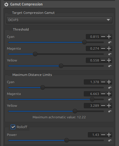 Questions remain unanswered. Where should the ‘Gamut compression’ function be placed in the process? At the beginning, at the end…? I chose the beginning (after White Balance), so that the rest of the process could be run with minimal artifacts. However, this raises a series of questions without any truly relevant answers in all cases. This is especially true when the ‘White point linear’ are out of gamut - and often by a significant amount (as with LEDs, sunsets, etc.).