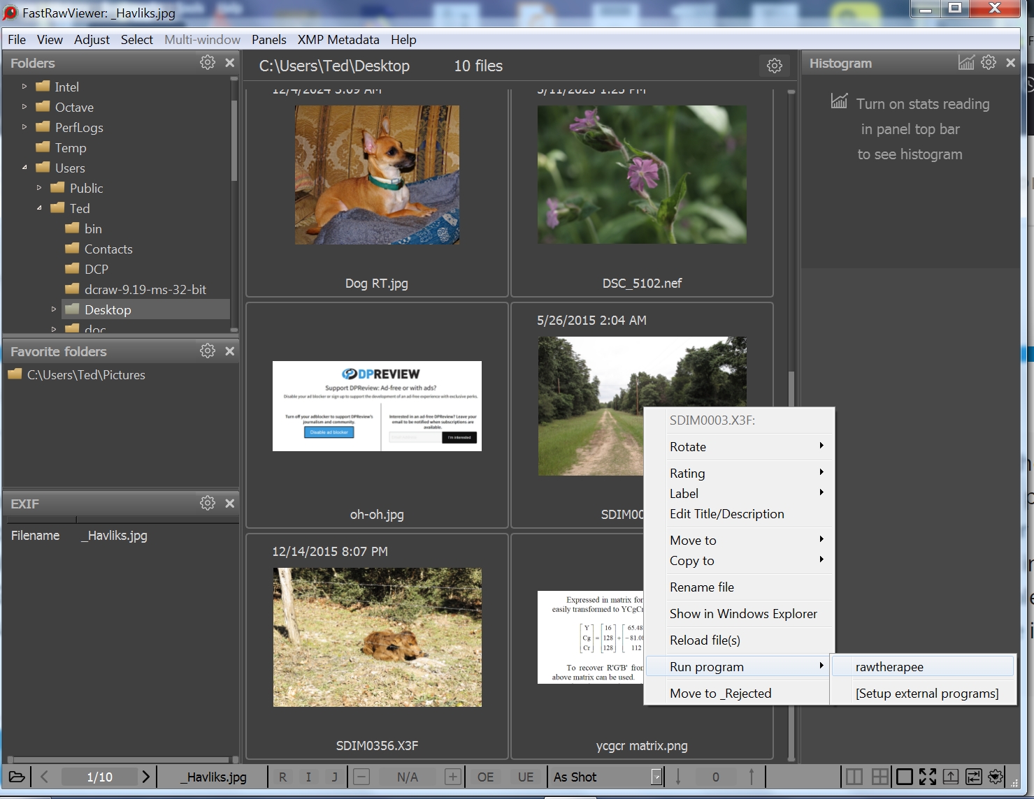 You can right-click on a thumbnail and open it in RawTherapee or other as shown above. You can also see the raw histogram and also the embedded JPEG and itās histogram - really good for previewing and culling.