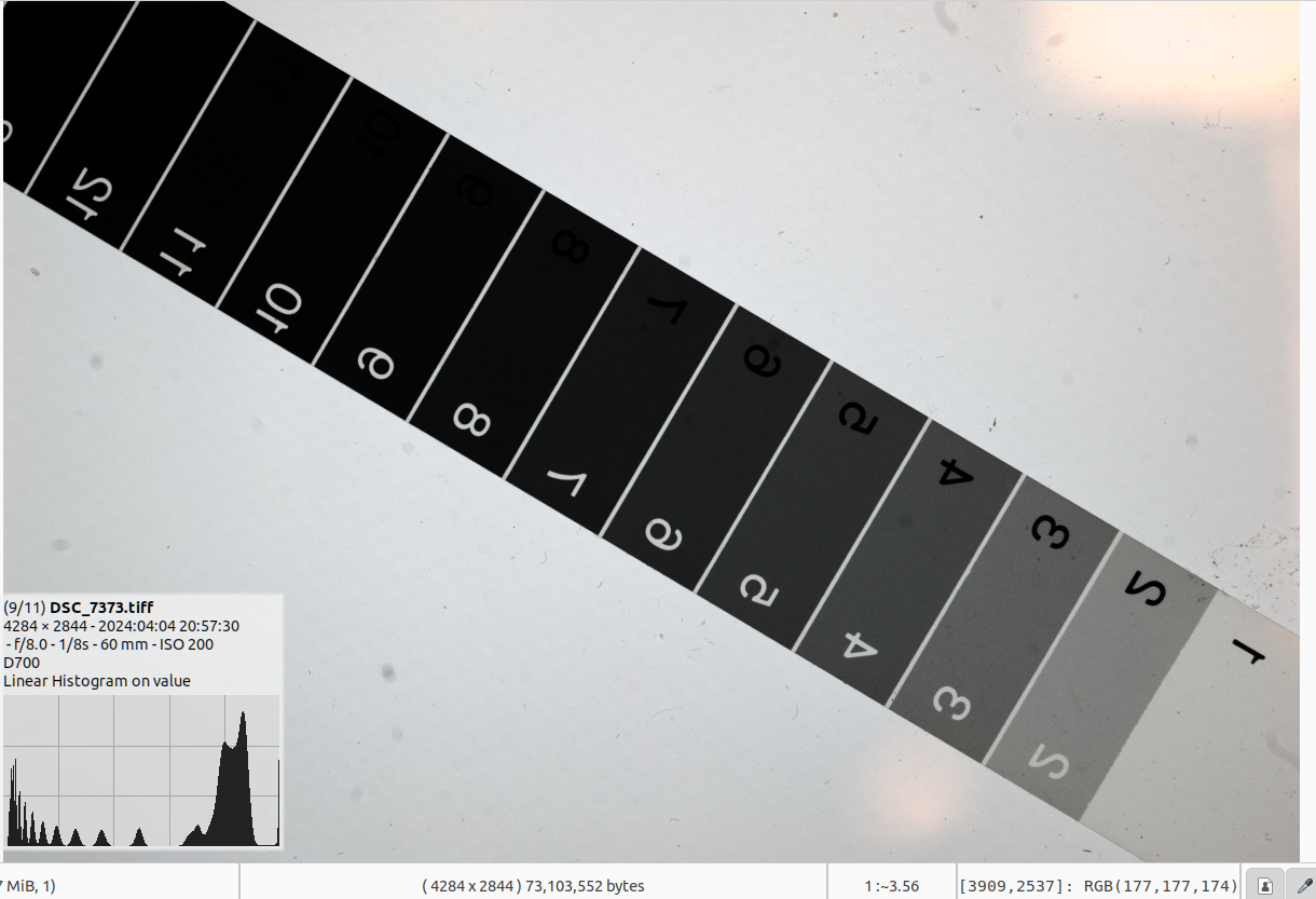For example in the tiff, of which I will attach to screenshots. I get RGB values of around 170/255, and for step 3 I get values of 90/255. i.e. nearly half. This is what I expected from my d700 in raw.