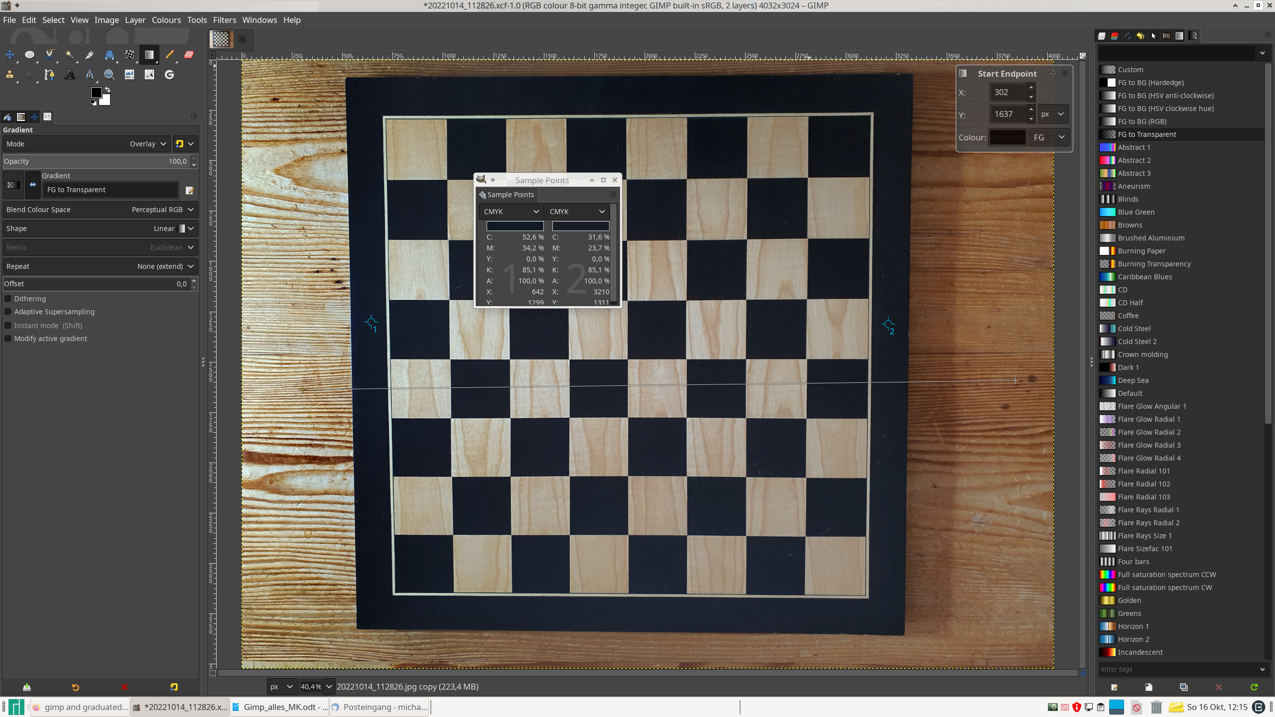 In honor of the good old Gimp I have to say: With RawTherapee and with darktable I cannot compensate this strongly uneven exposure of the chessboard at all reasonably. If I apply the Graduated Filter of the Raw developers, then the formerly bright, left side becomes darker but above all also grayed.
