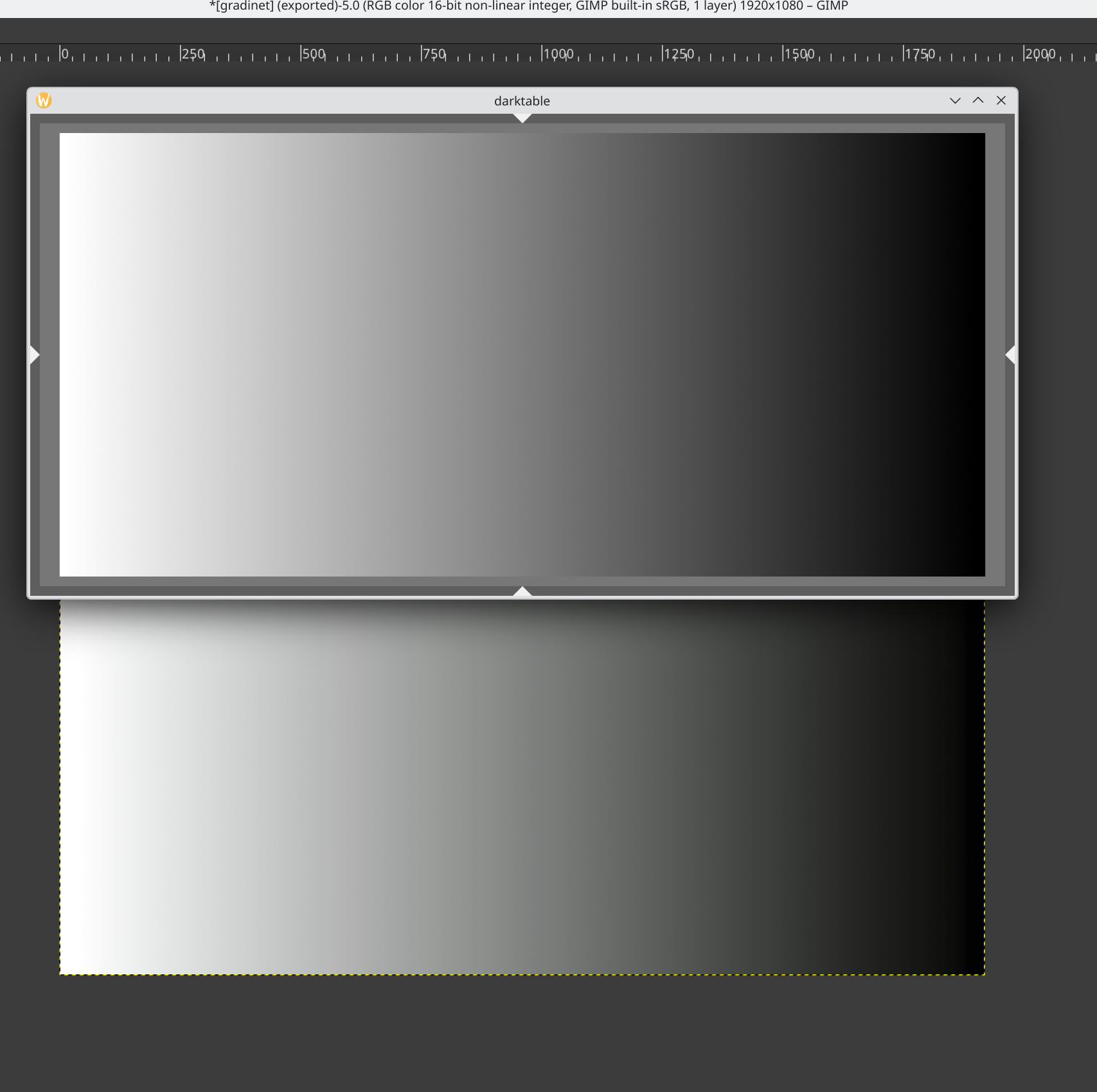 The Gimp window reads, for example, 77, 79, 76, which, I think, is normal, as my display profile is not sRGB.