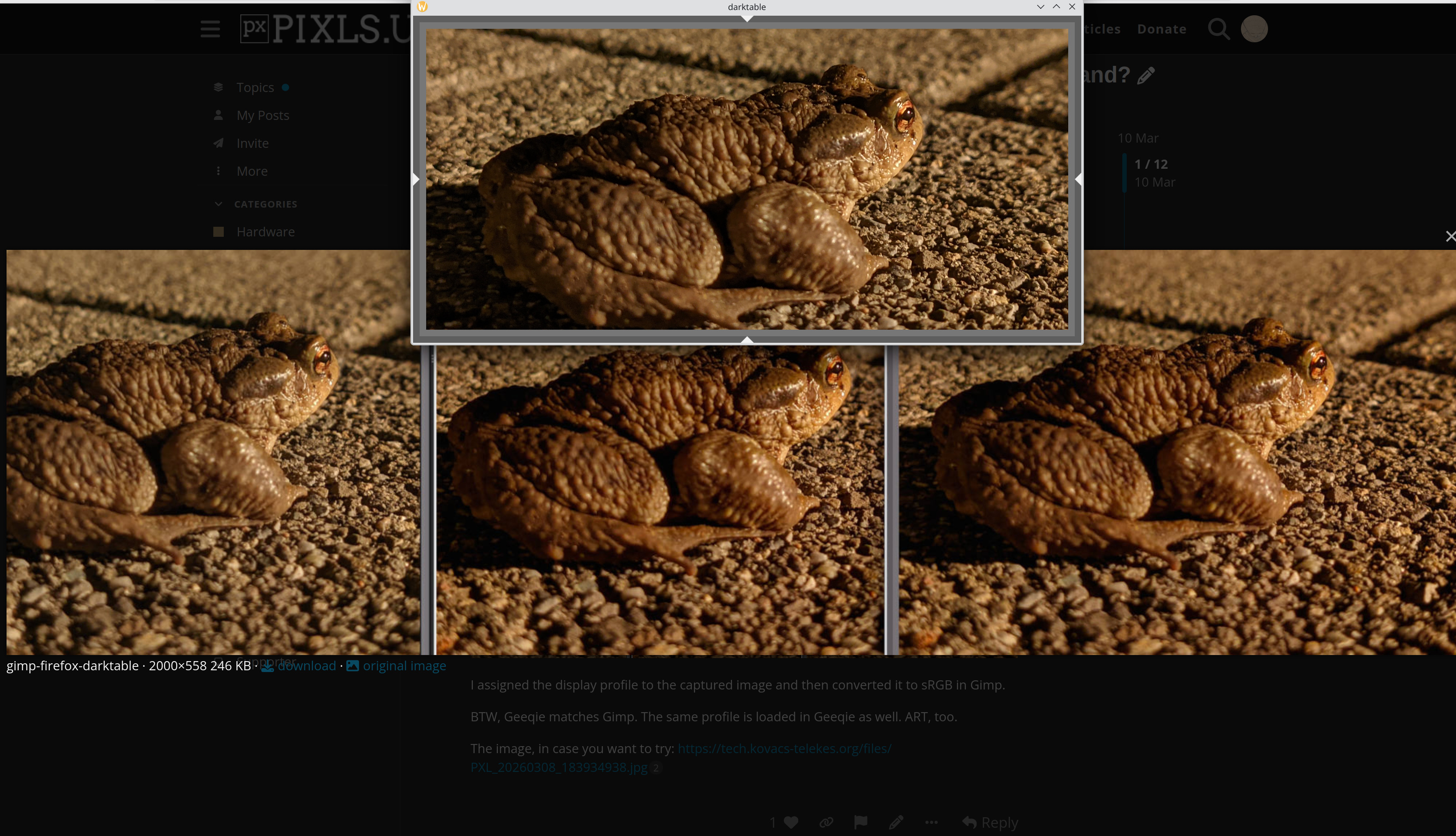 No matter what I do (Gimps prompts me to convert to its own sRGB or keep the existing, with/without black-point compensation), I cannot get them to match; Gimp being the one that’s wide off from the other two.