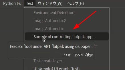 I have made GIMP3 python plug-in sample program to control Flatpak application. This sample program controls Exiftool under ART flatpak version.If user runs this and selects a target image file, it shows the compression type of the file in error console.