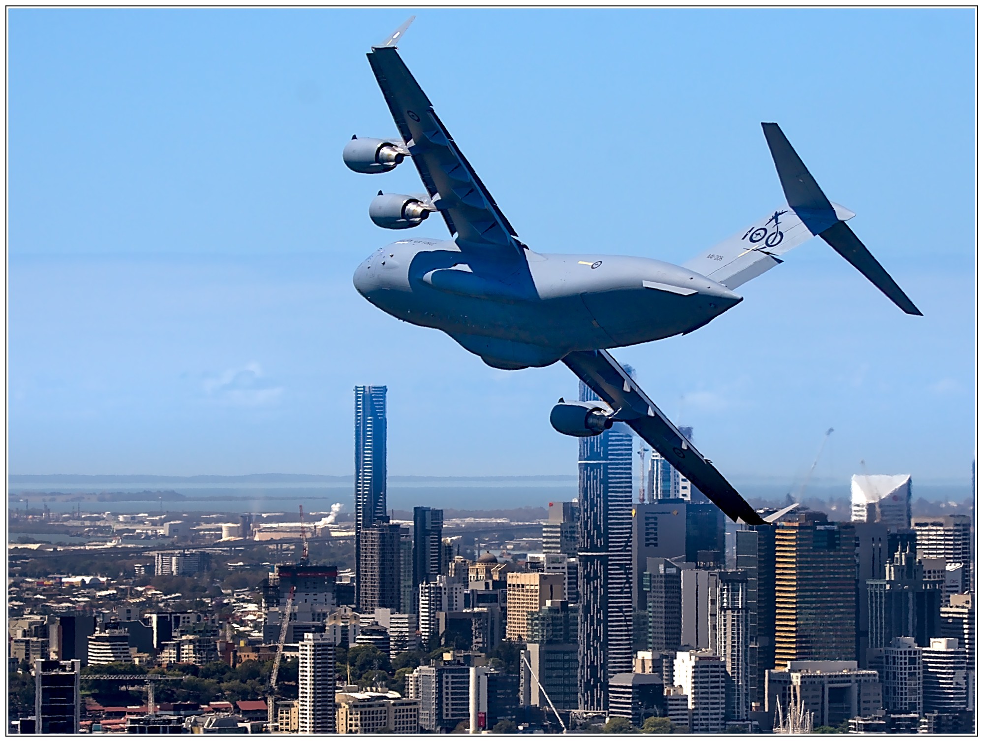 Hi everyone … yesterday the RAAF Globemaster-III made a few passes over the city in rehearsal for Saturday’s Riverfire event. Though I had to tilt from the horizontal to get the wingspan into frame, this is my favourite capture.