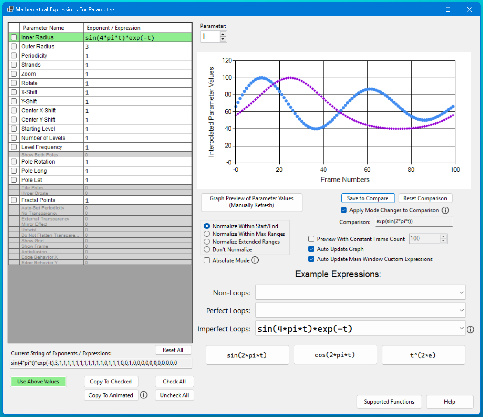 - Able to animate based on both ‘t’ (normalized time from 0 to 1) or ‘x’ (frame number)