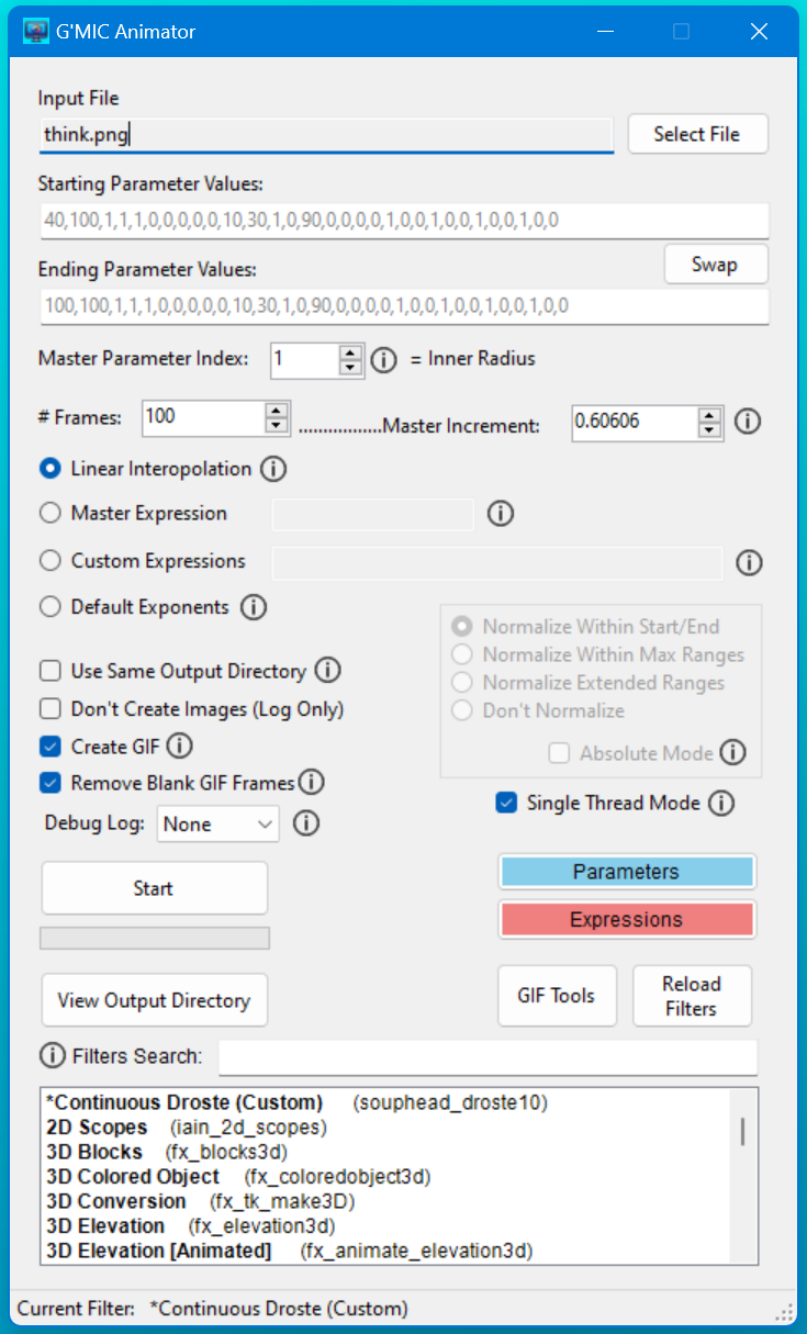 I started out just intending for it to be for the Continuous Droste effect, but realized I could just parse the big gmic filter file from the GUI and have it adapt to each filter.