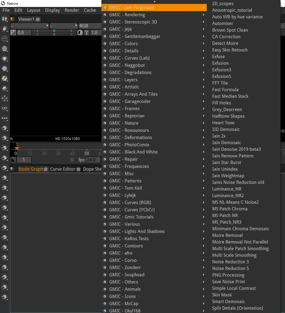 So I made good progress in the last days, I can now parse the latest 2.9.3 filters and make them available in hosts like Natron. “Unfortunately” even when skipping the about, animated, interactive, sequences, etc. filters that do not make in a render-only context, we end up with more than 1000 filters, which makes it quite difficult to present in a context-menu like in Natron or Nuke, see here: