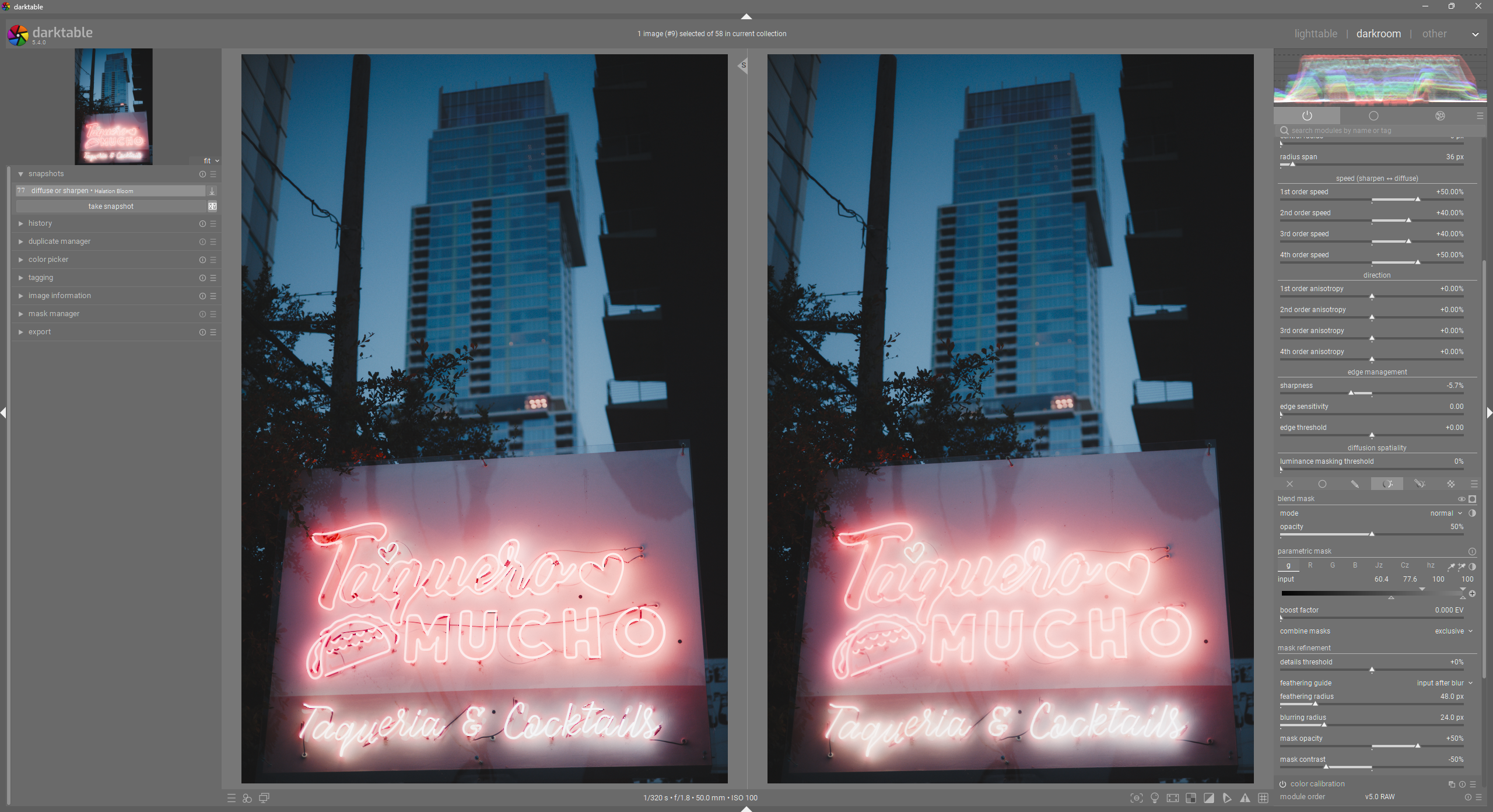Currently, I am using a luminosity range to smoothly target the higher brightness areas of the image. I am also using the detail slider to target areas with higher contrast, which is also a feature of halation.