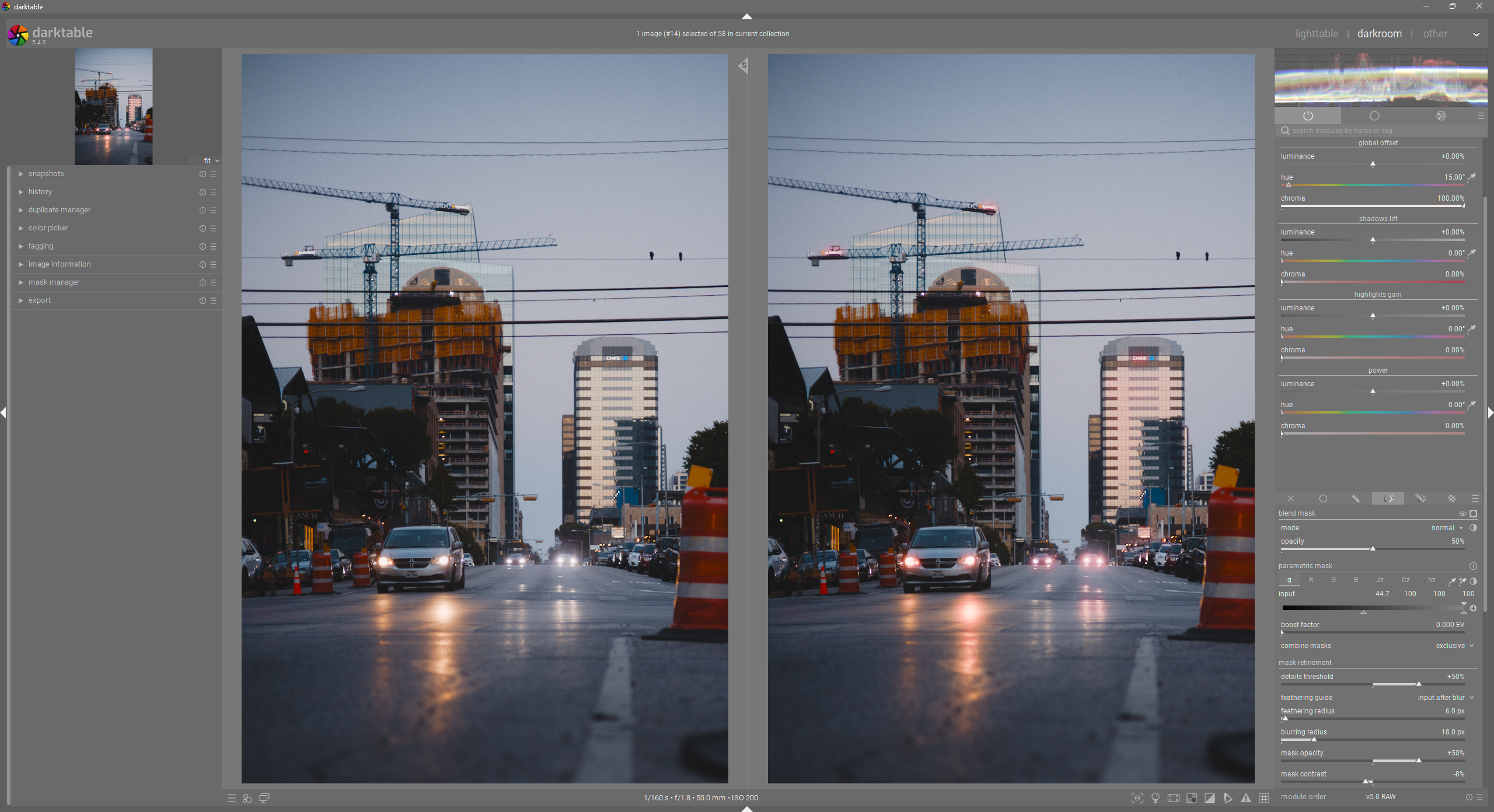 You will notice that I have the overall opacity of the color balance rgb module set to 50%. Since I wanted to make this a module preset, I targeted 50% opacity to be a nice middle ground, so that I have room to easily increase/decrease the effect.