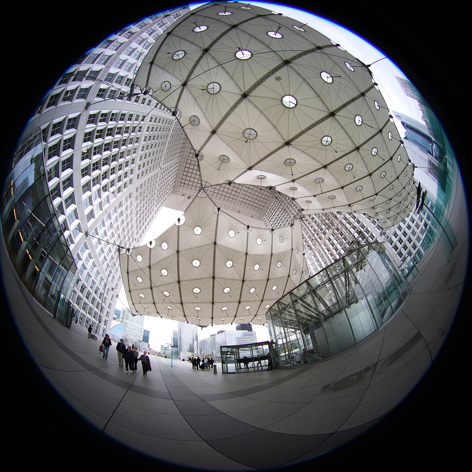Lovely use of the distortion of the lens. Love the geometric roof and the red sculpture. Lenses with that wide a field of view are difficult, but fun!