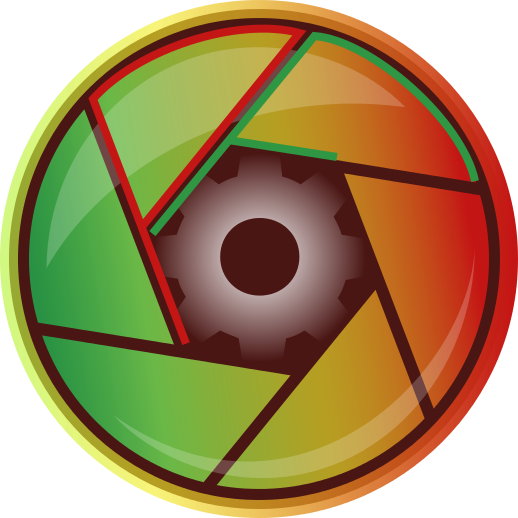 The gears symbolize “workflow/editing” and the aperture blades symbolize “photography”.