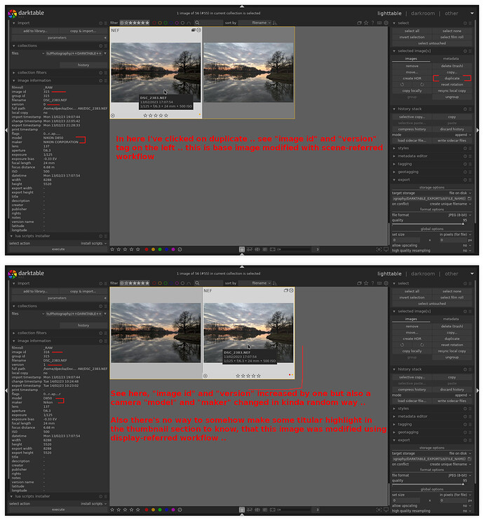 thank you very much for your input … I was looking into it but I went into the impression (I was experimenting with it a bit), that while it applies the default modules for given workflow when you initially open an un-edited image, it also derives dynamically (some) values for modules in use from the scene (from the raw) and if you save the “style” like that, you basically “hardcode” these otherwise dynamically derived values … See please screenshot below … I just opened two un-edited images with scene-referred workflow to demonstrate it …
