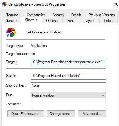 On the properties for the shortcut named darktable I have a target of C:Program Files\dtProgramFiles\DT420\bin.