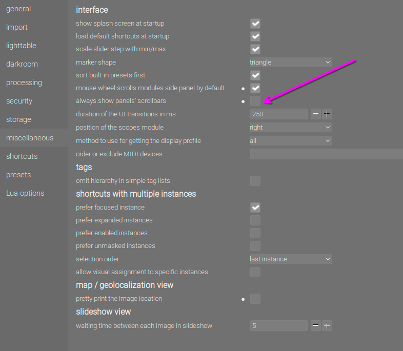 In the miscellanous setting, for example — generic and related to the UI — if “always show panel’s scrollbar” is disabled, it should be consistent and remove them everywhere.