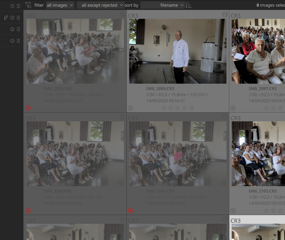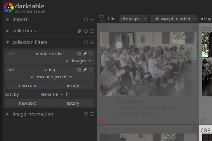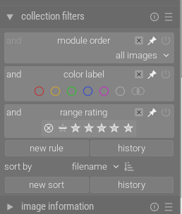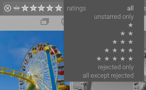 “all images,” “All except rejected,” “Rejected only,” “not rated only,” and one- to five-star stars are selectable from a right-click drop-down menu, as well as by clicking or dragging on the symbols. I am, and have been, seeing this on Linux Mint. I’m supposing they would reset any existing and/or filter, but I’d certainly check the collections and collection filters module themselves in the left panel.