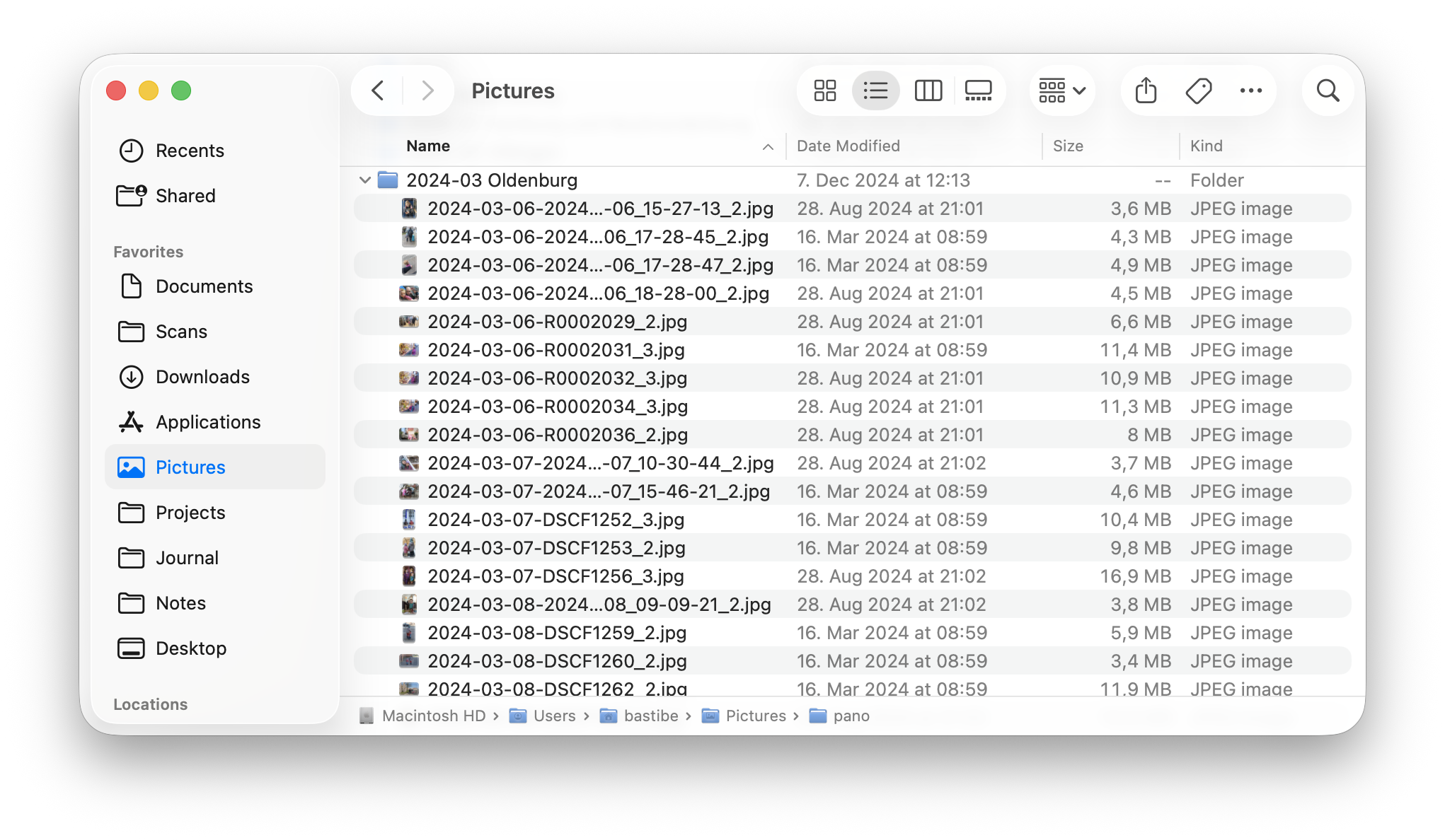 Inside these directories, there is a flat list of JPGs, each prefixed with the capture date. This lieaves the directory content correctly sorted for browsing, regardless of application. The file name also contains enough information to find the matching raw file in my archive.