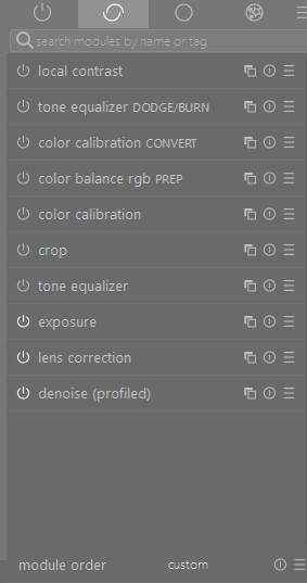 a) the modules I added and their sequencing in the pixelpipe, all in darkroom;