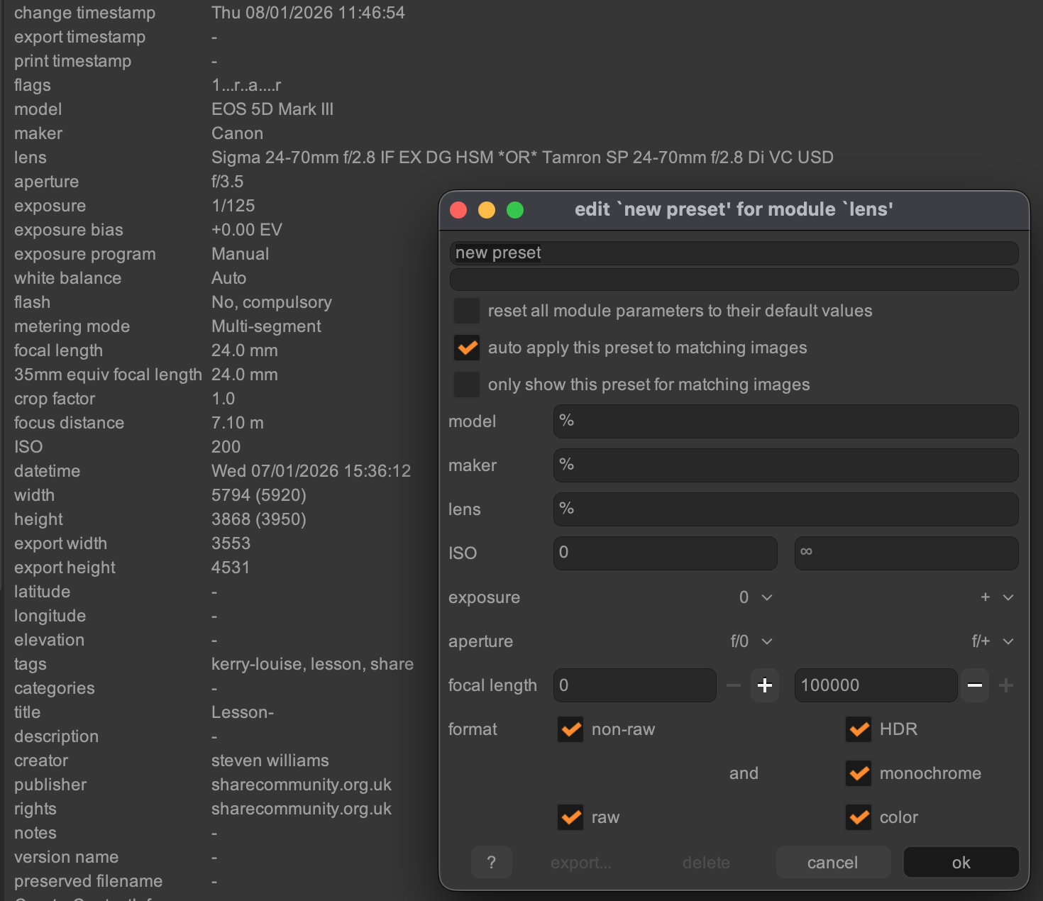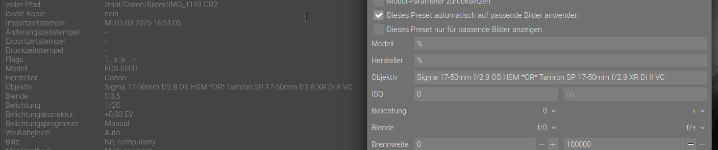 On Linux too. This works perfectly, thank you. Since I’ve never messed around with stuff like that and wasn’t aware of this function, I would like to add that you have to refresh exif on already imported photos after creating the file/entry: