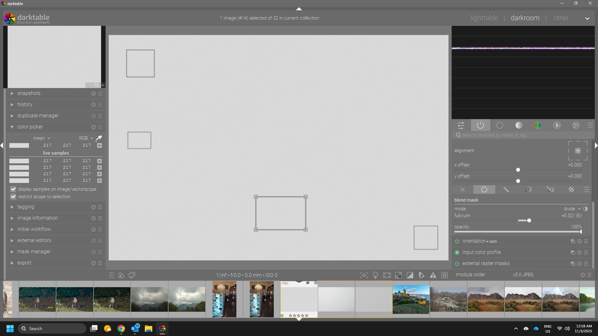 I discovered the external raster mask option in Darktable, and thought, that might be just the right tool. So I exported the image as a PFM file, and then imported it on the same image file as an external raster mask. Then I went to the exposure module and selected that mask, with blending mode lightness. In my idea, if I would adjust the exposure, I would find a way that perfectly corrects it to have a completely homogenous image brightness.