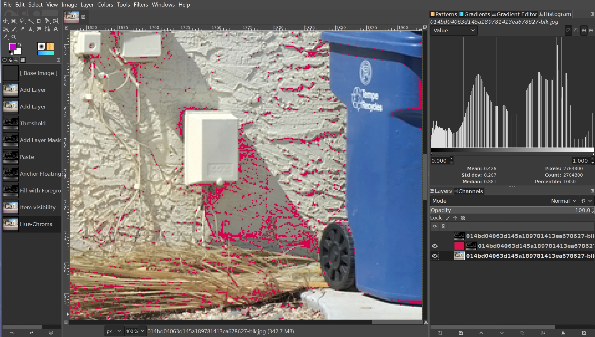 So here’s an example of the principle suggested where “mid-gray” is all levels between 0.474 and 0.516 (see histogram) and the edit of those levels is to set them to a color - but any other editing could have been done …