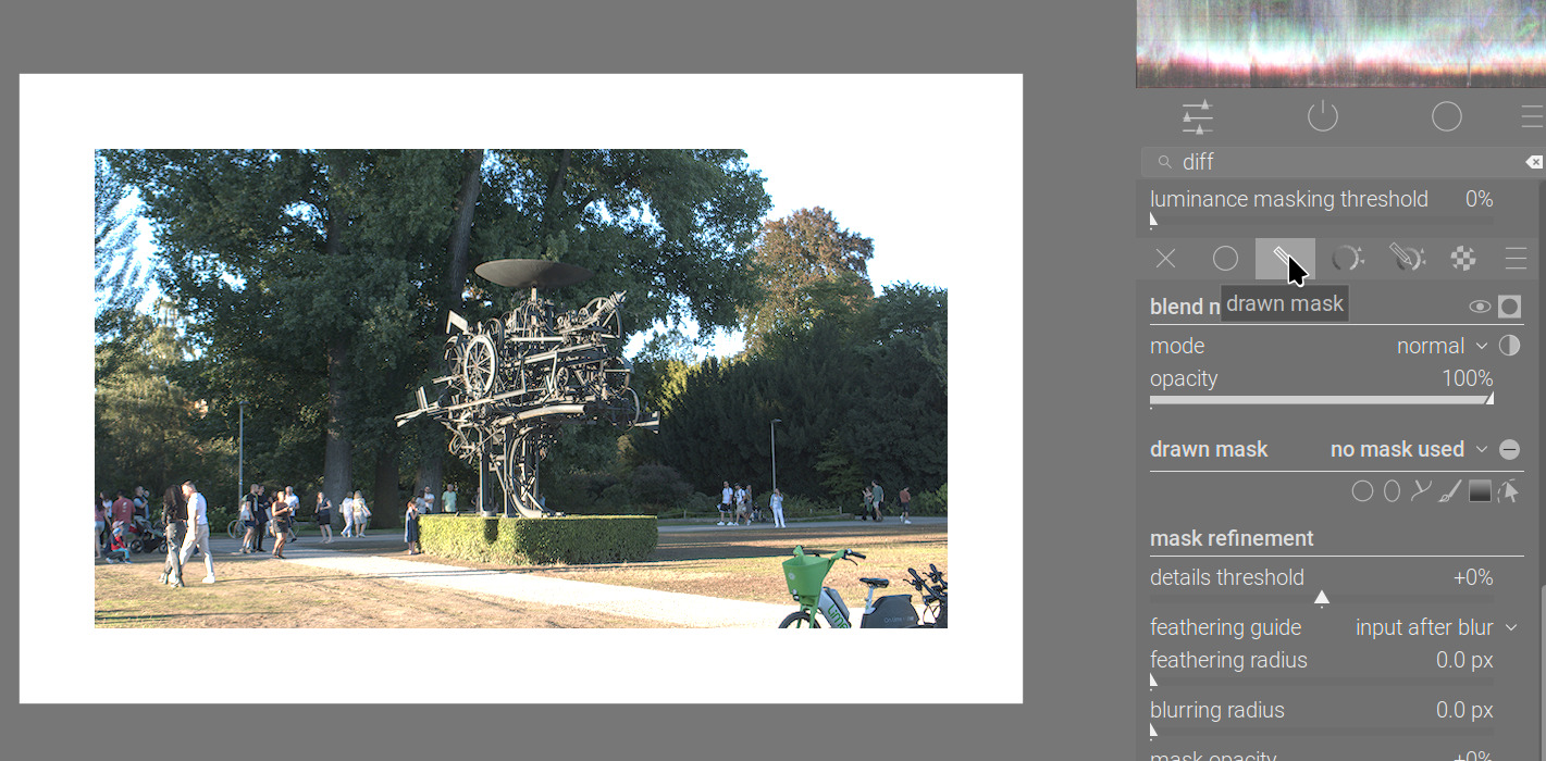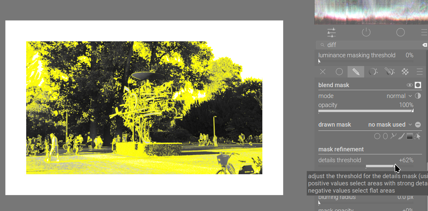 Such a mask can be reused as a raster mask across multiple sharpening modules, or created in inverse (using a low details threshold to only include flat areas) for denoising, and applied as an inverted raster mask (only detailed parts) for sharpening.