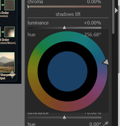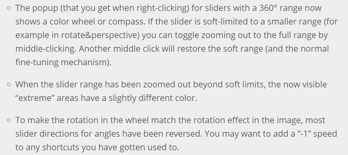 Damn, but it doesn’t work with the sliders where I most wanted this feature: hue sliders in the masking options! You know that issue where if you want to restrict to hues around red you need to reverse the polarity. It would be nice to select from a wheel instead of doing this.