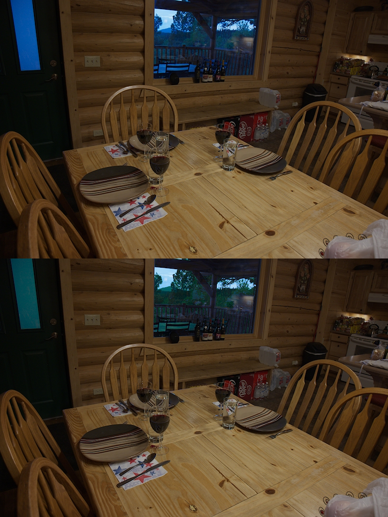 We spent last weekend at a cabin in the mountains, and I shot a lot of interior images. And that pesky picture window is in a lot of them. I was about to power up GIMP and some @patdavid tutorials to do some layer masking, but I got to thinking about the situation: the regions of concern had a significant discriminator, that being a heavy bias in the blue channel. Bear-of-little-brain starts thinking, “how could I use that fact to segregate the ‘exterior pixels’ in a second application of white balance?”