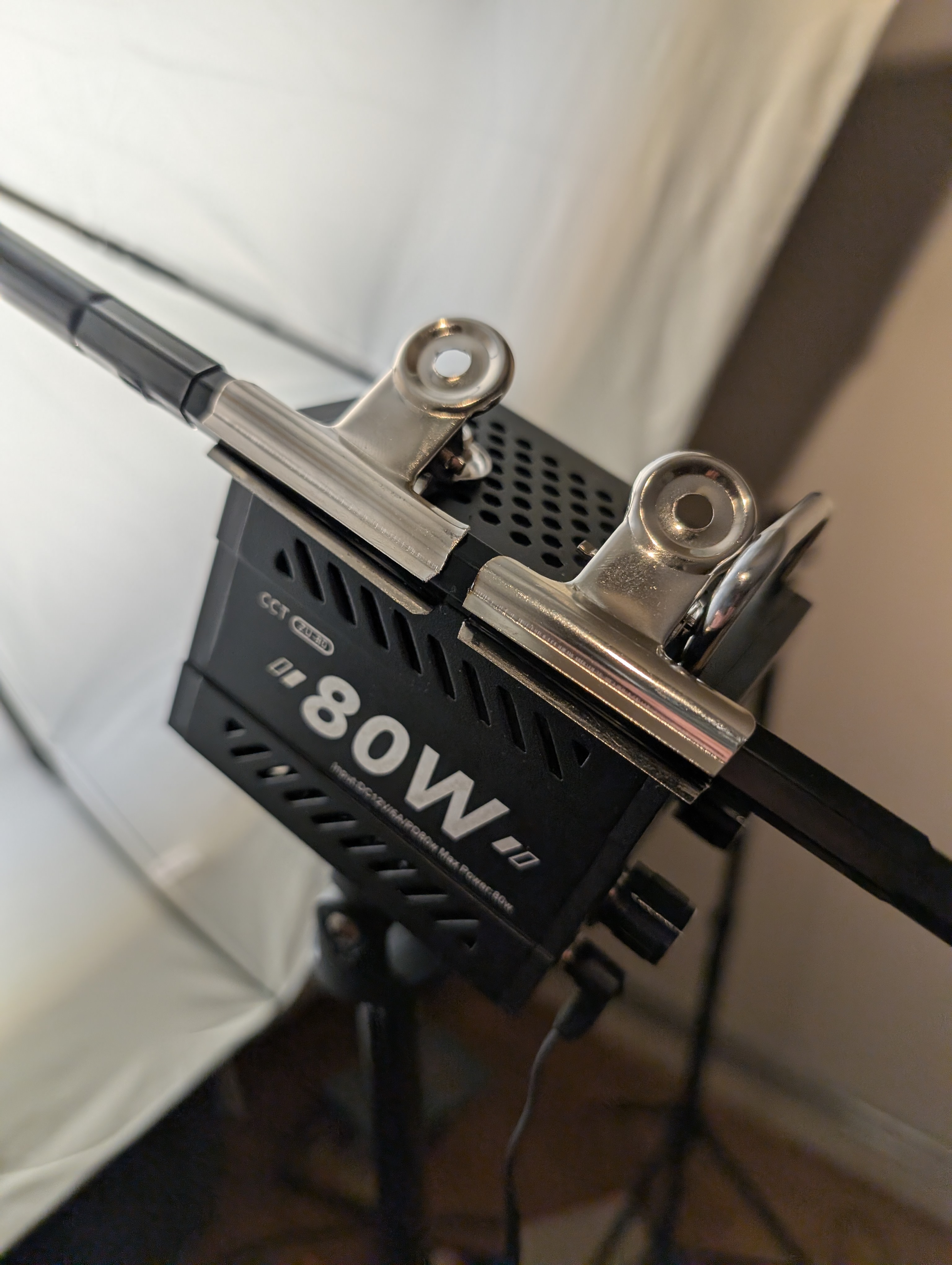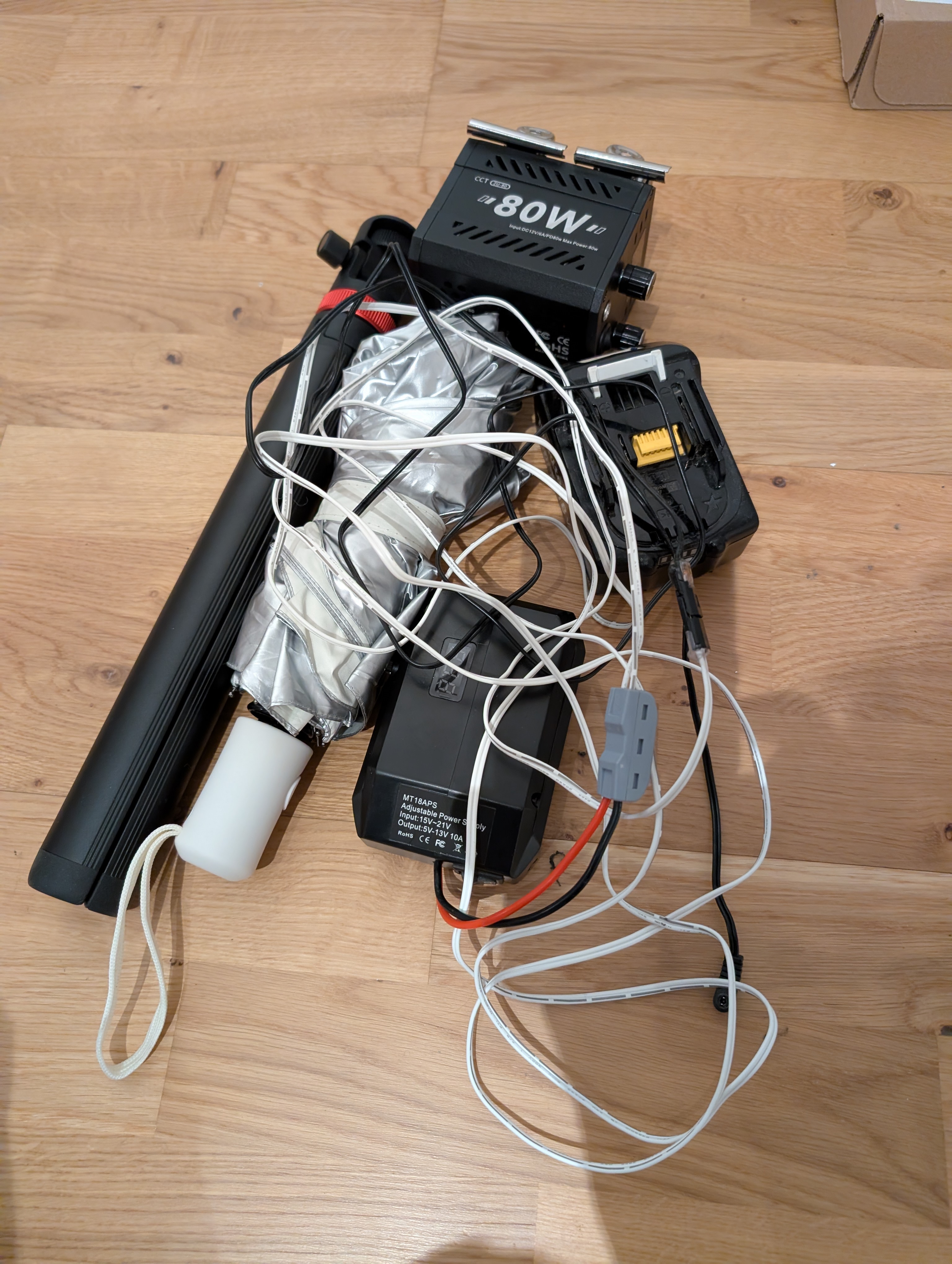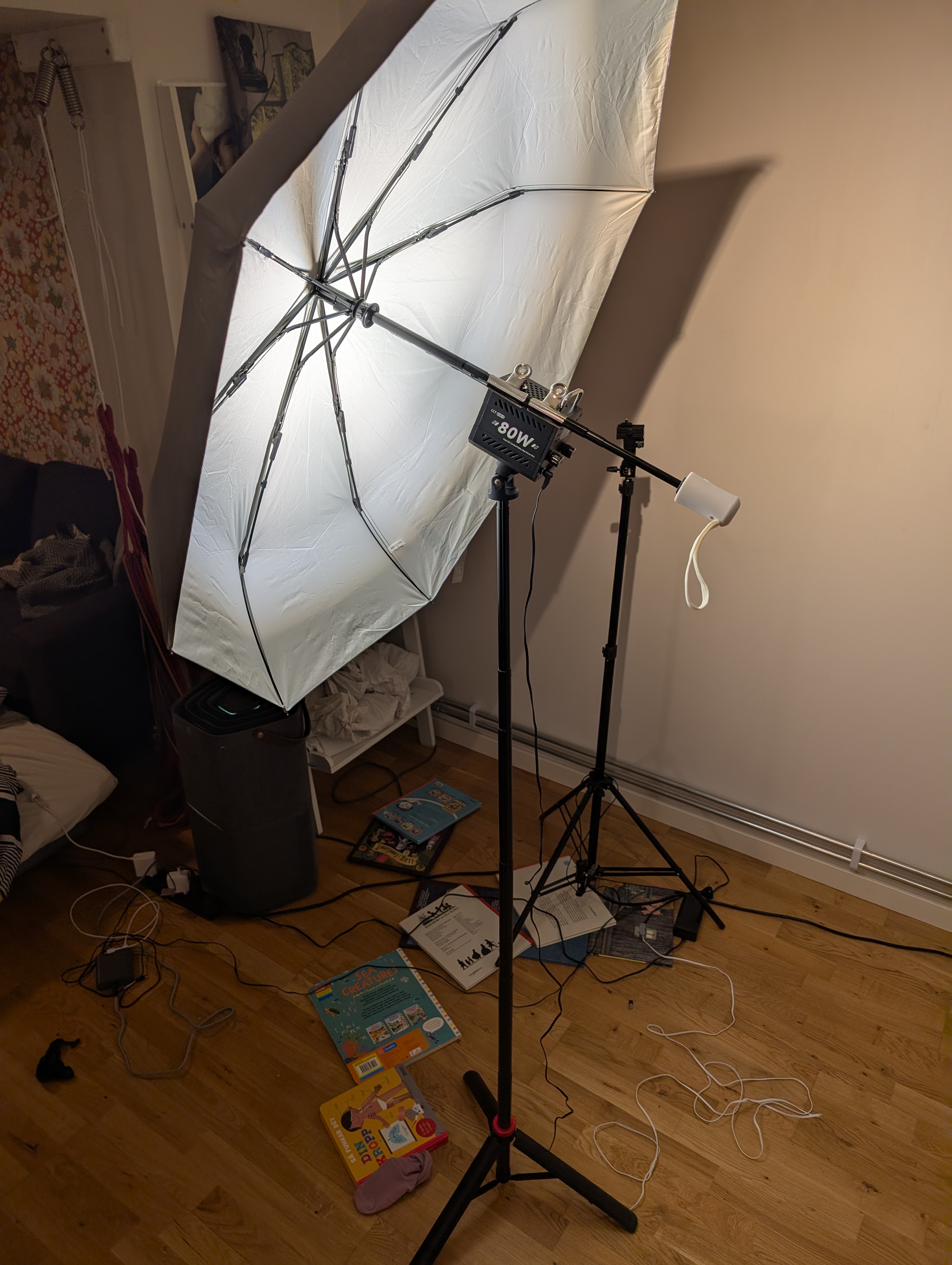 New year’s resolution is to take more portraits, and for that I wanted a cheap but super portable lighting setup, so small that I could bring it with me every day in my (admittedly large) bag I bring wherever I go. The light is a cheap ZU-80 80W bicolor, and I replaced the AC adapter with a 12v step down converter for Makita batteries. The stand is Ulanzi, which just about holds up the light and the umbrella. The umbrella is an ordinary trifold UV protective type that’s completely white and reflective on the inside. It all comes together quite small!