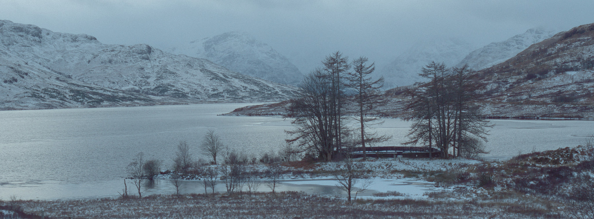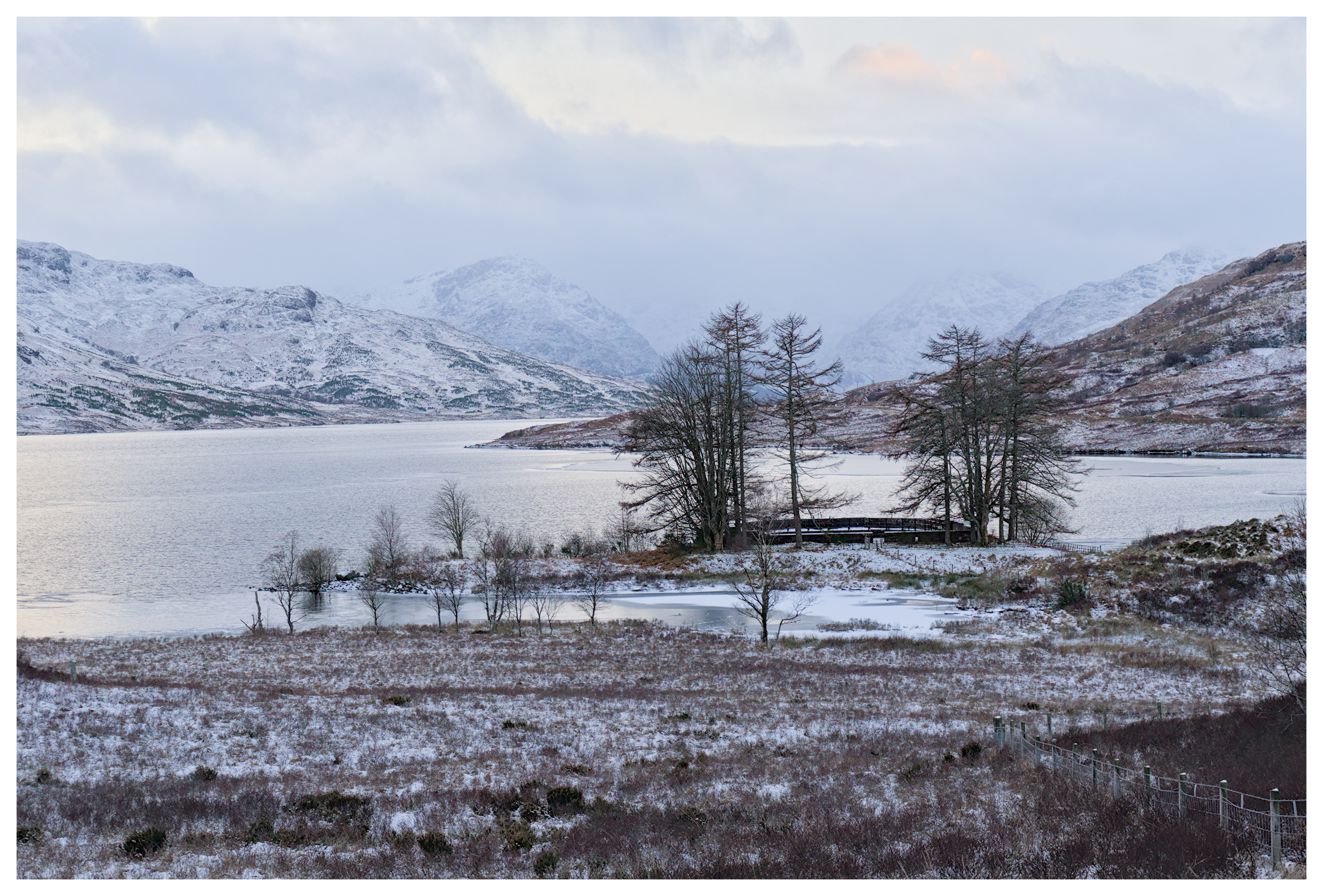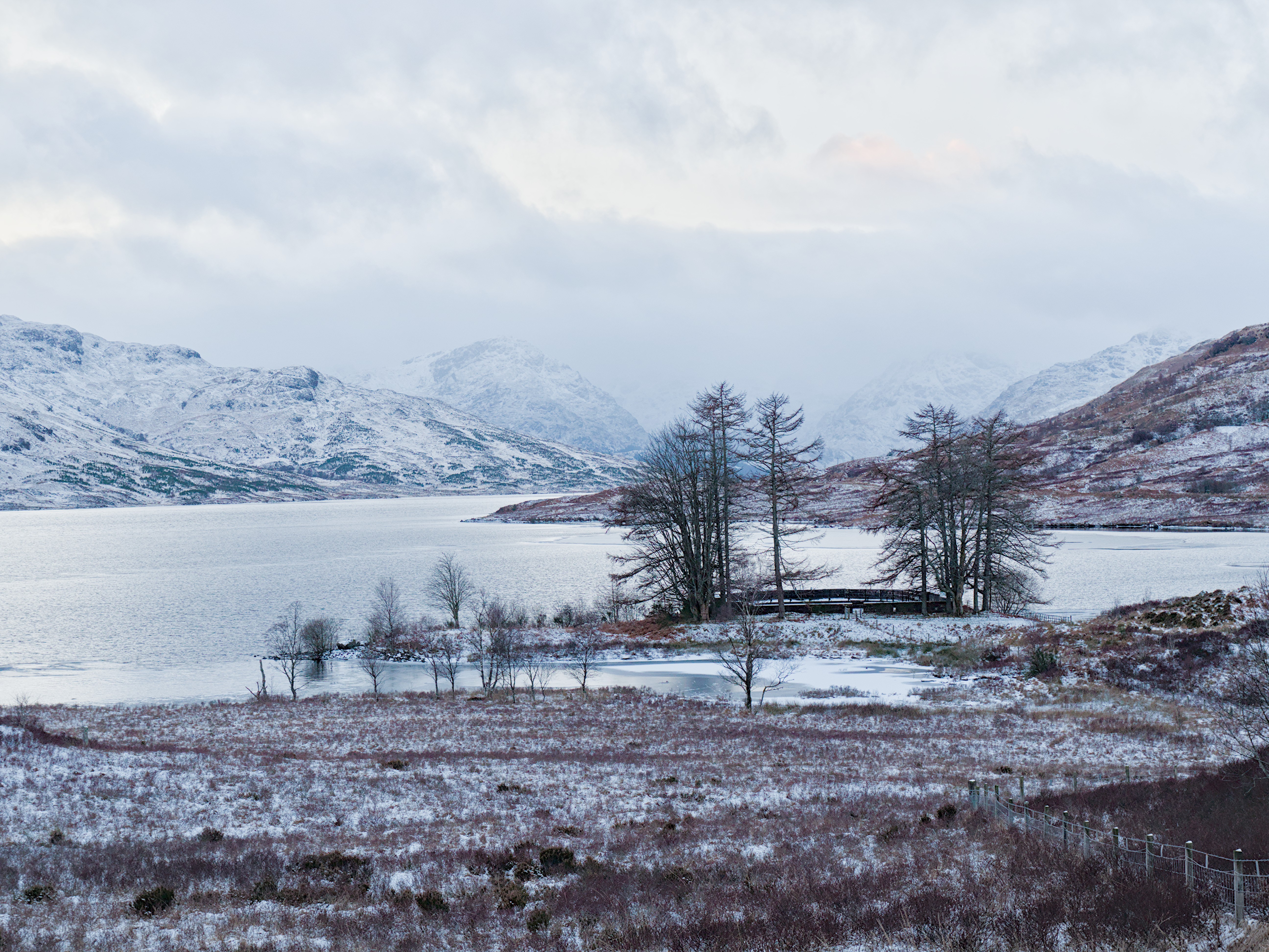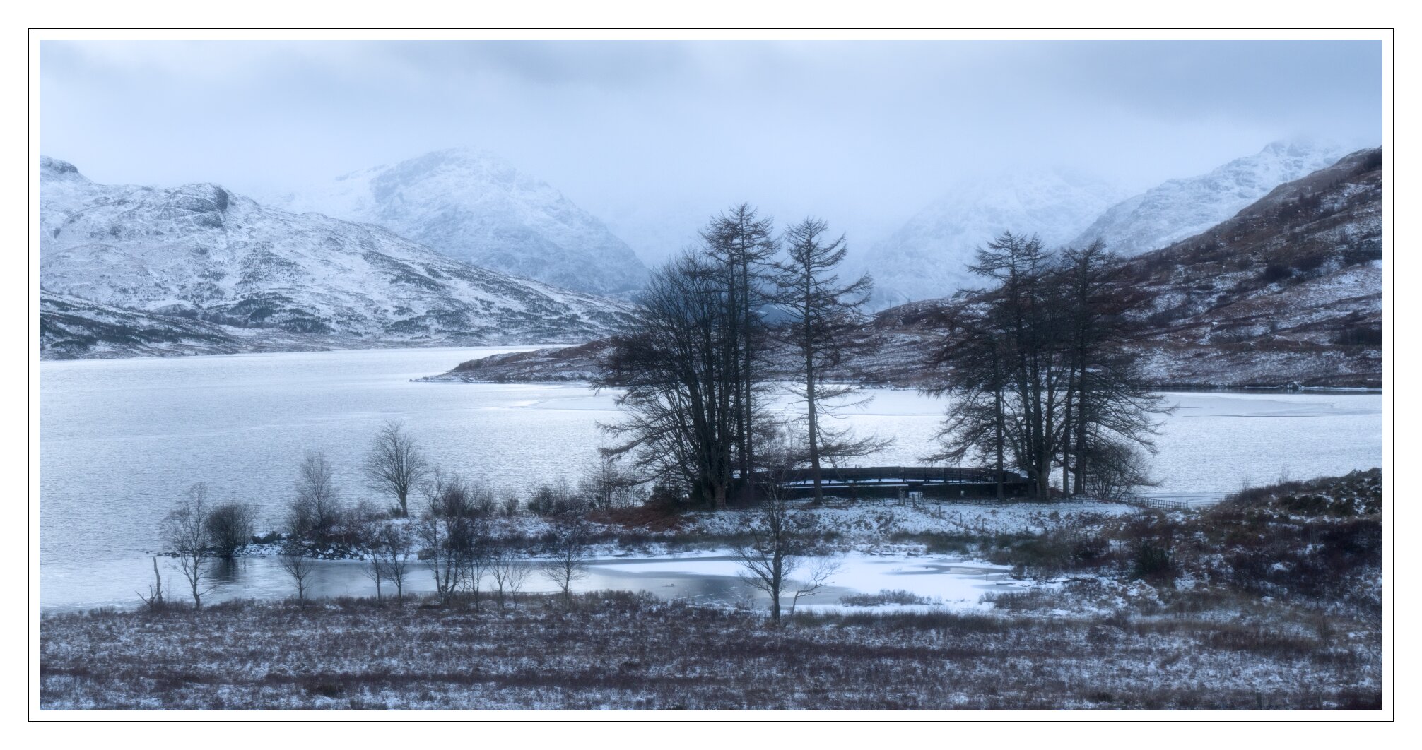 The pic is at Loch Arklet in Stirling in the Scottish Highlands. There’d been a day or so of light snow, followed by freezing temperatures (minus high single digits overnight) for two days in the area so decided to see what it was like. The road to the loch from Aberfoyle becomes single track and though somewhat gritted, it started to get too sketchy, broken up and icy with compacted snow for the 2WD I was driving. So this was as far I got. You can drive quite a bit further down an even narrower unmarked road the length of the loch and I’d tried to call a hotel at the end of that road to see if it was passable but they said the place was closed from October for the winter, Overlook Hotel-style.