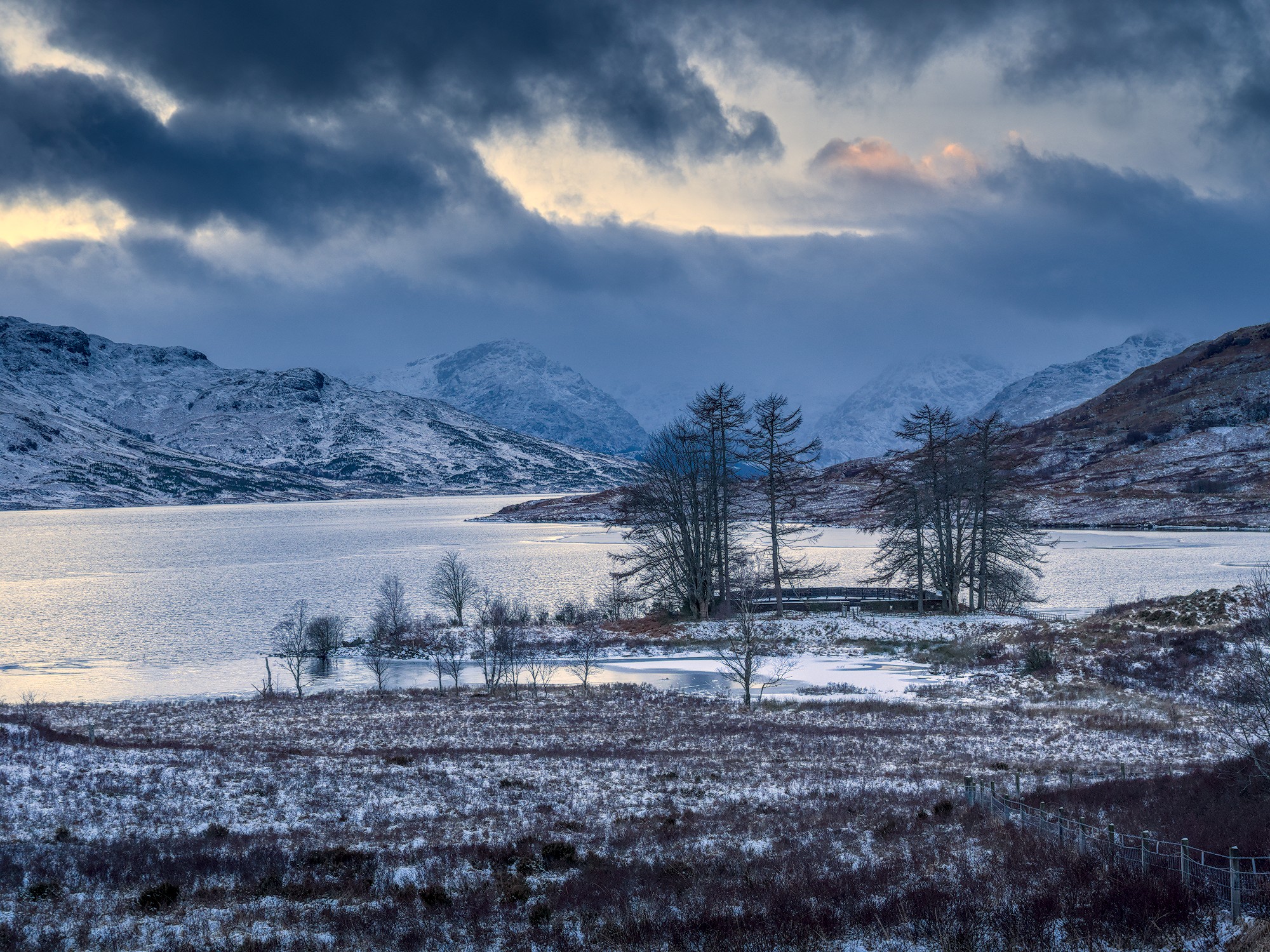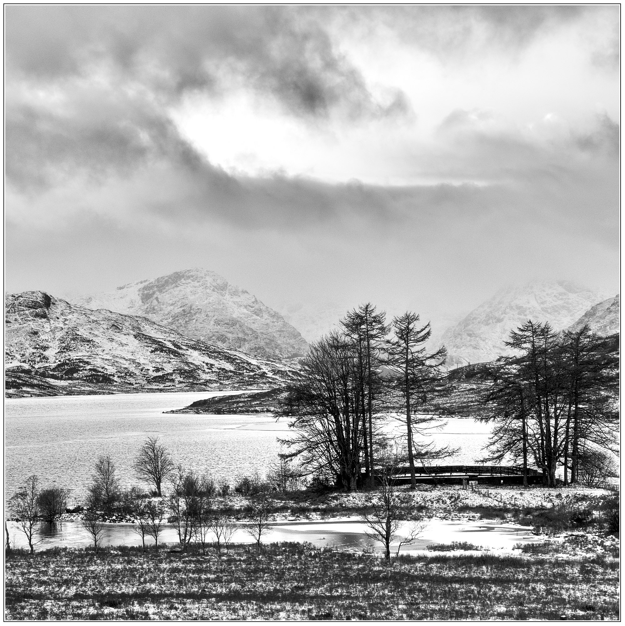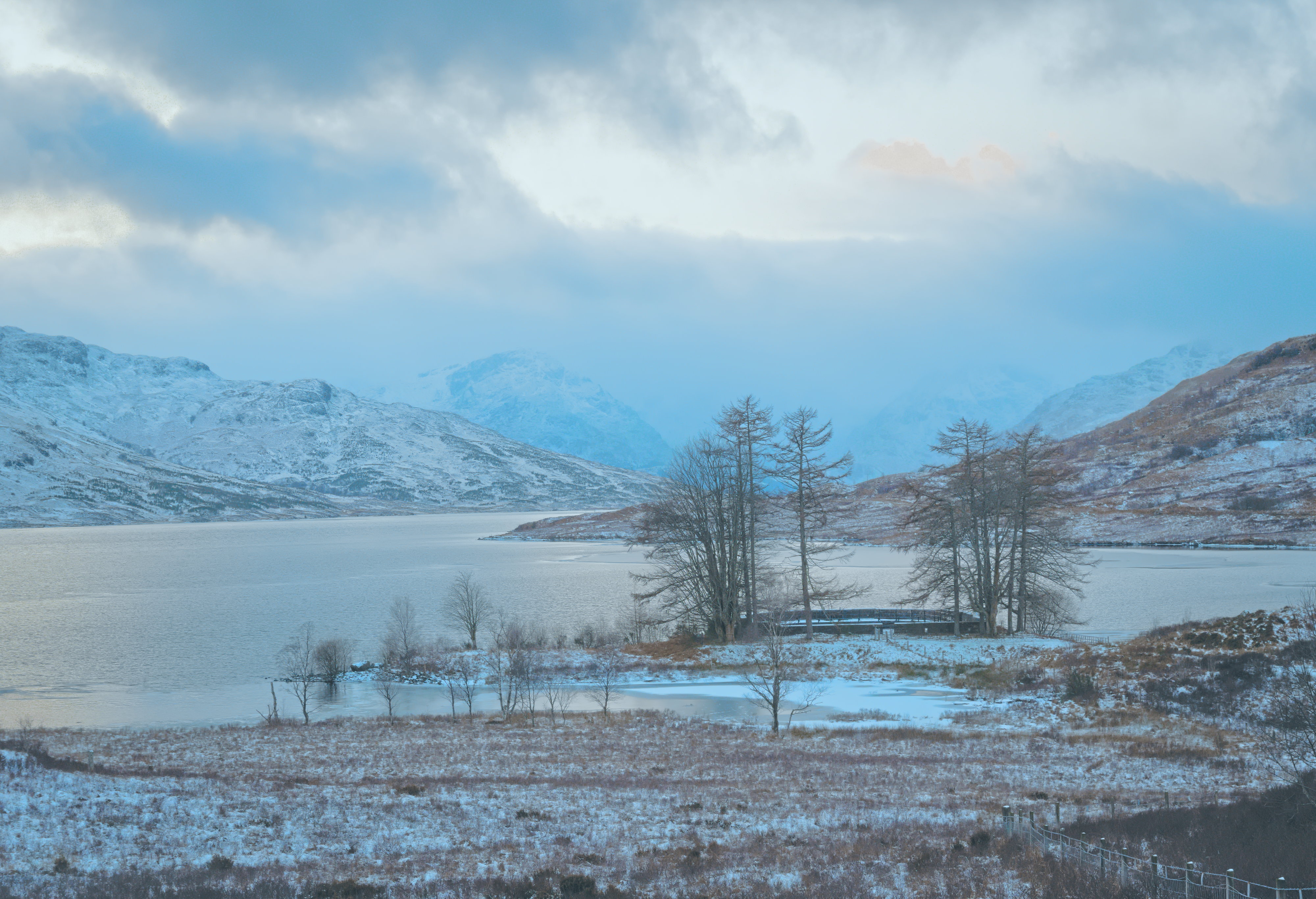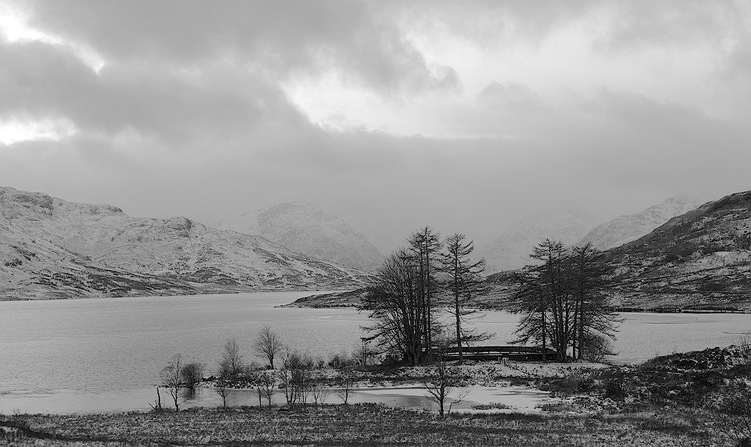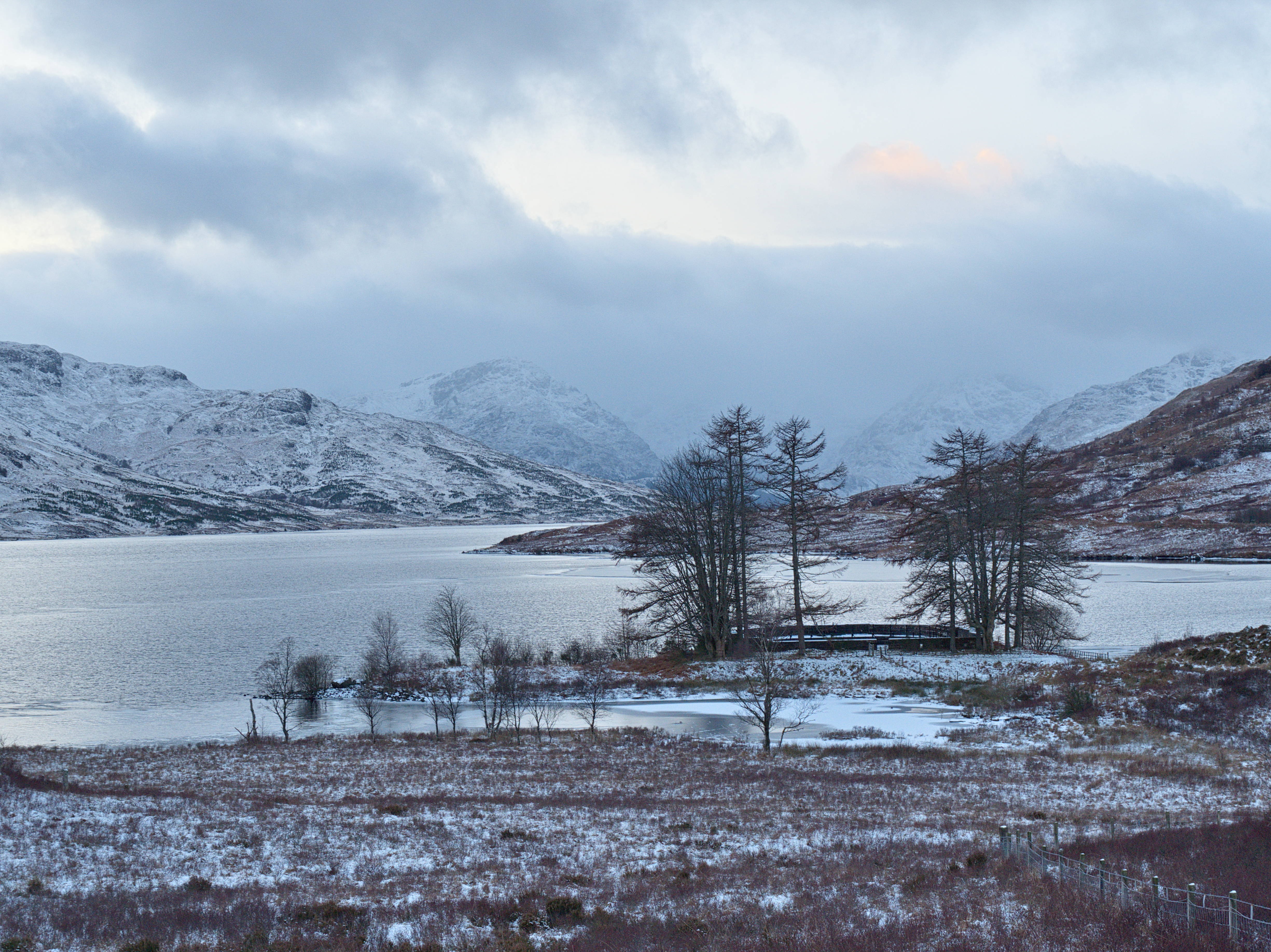 The pic is at Loch Arklet in Stirling in the Scottish Highlands. There’d been a day or so of light snow, followed by freezing temperatures (minus high single digits overnight) for two days in the area so decided to see what it was like. The road to the loch from Aberfoyle becomes single track and though somewhat gritted, it started to get too sketchy, broken up and icy with compacted snow for the 2WD I was driving. So this was as far I got. You can drive quite a bit further down an even narrower unmarked road the length of the loch and I’d tried to call a hotel at the end of that road to see if it was passable but they said the place was closed from October for the winter, Overlook Hotel-style.