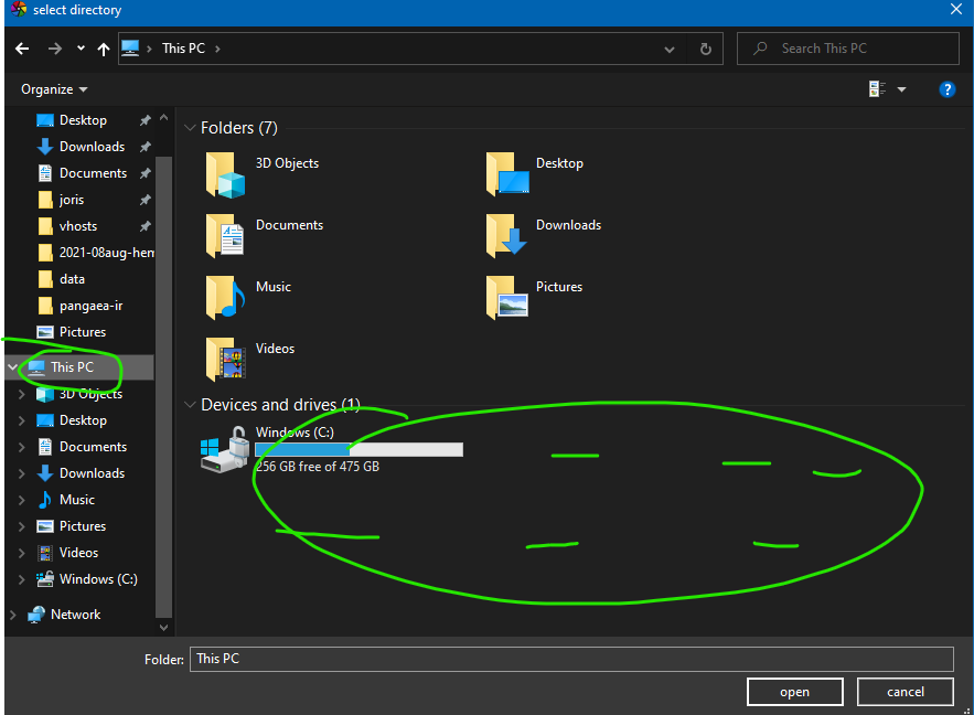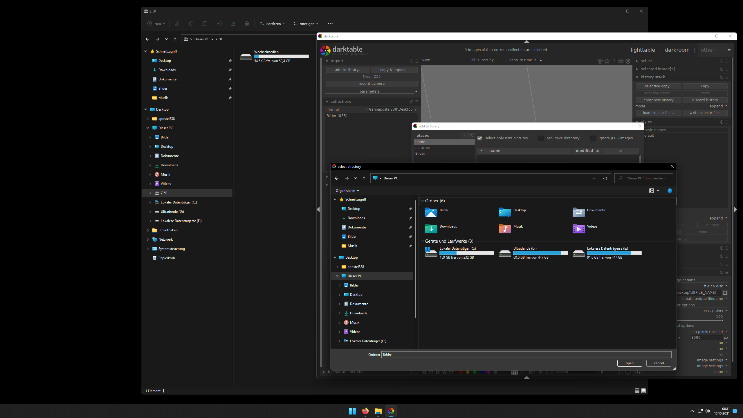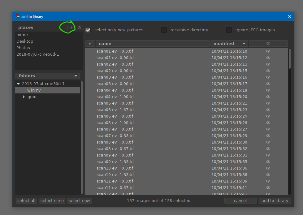 You have to click the little ‘+’ sign next to ‘places’ to add a drive letter / folder. Select the drive-letter and/or folder from your camera when it is connected. After adding this ‘as a place’, you can select it and navigate the folder structure in the section under it.