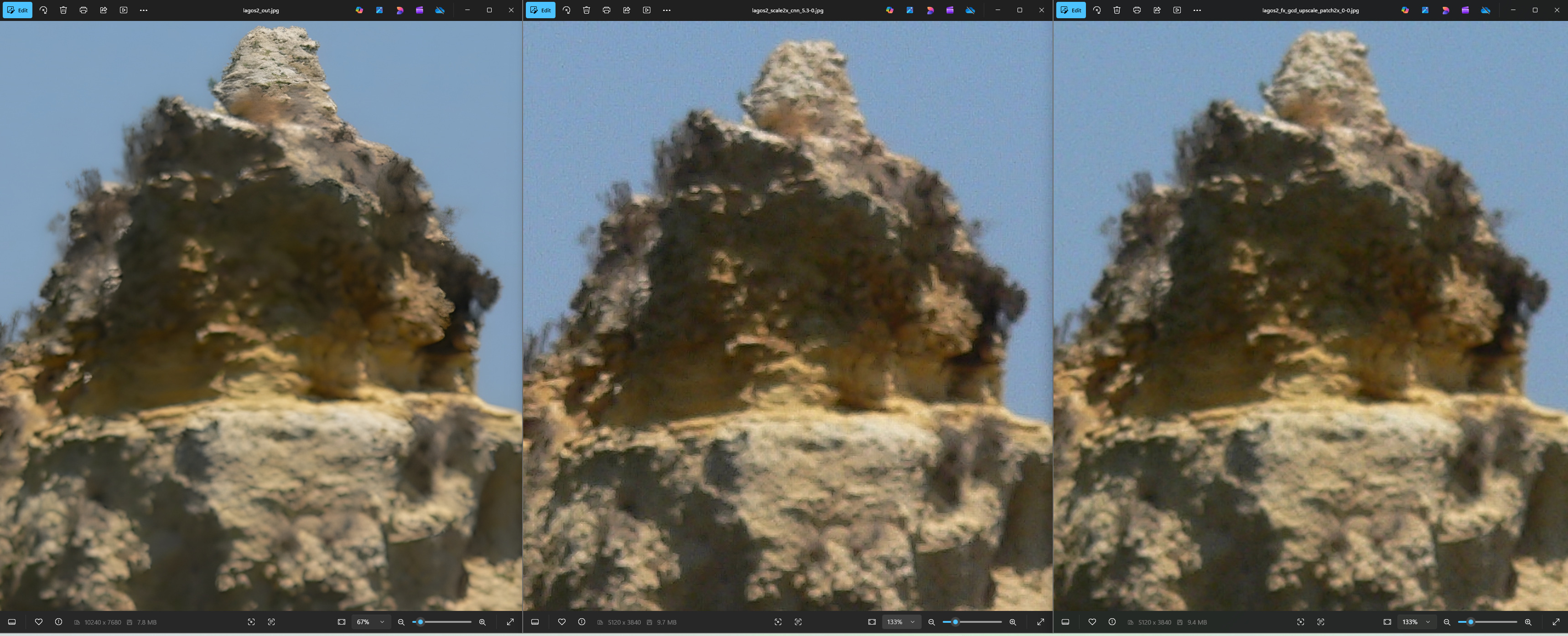 The leftmost is RealESRGAN_x4plus at 100%, I randomly picked two of your other upscaled 2x images at 133% to match resolution. The left one has clearly cleaner sky and more details.
