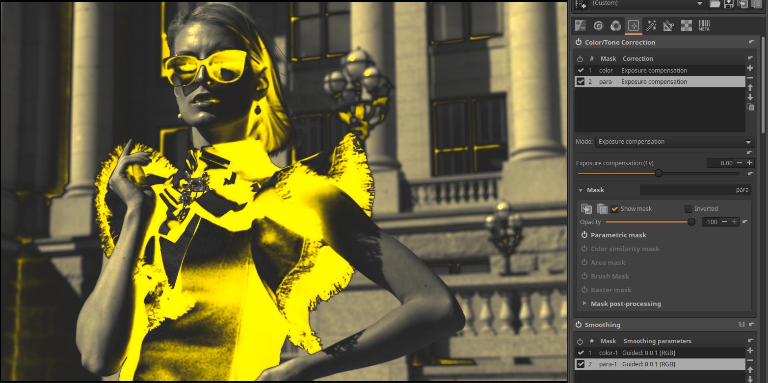 I would even like to add that “Color” is the Color Similarity mask and “para” is a Parametric mask. I used two separate correction layers, but it works the same with one correction layer.