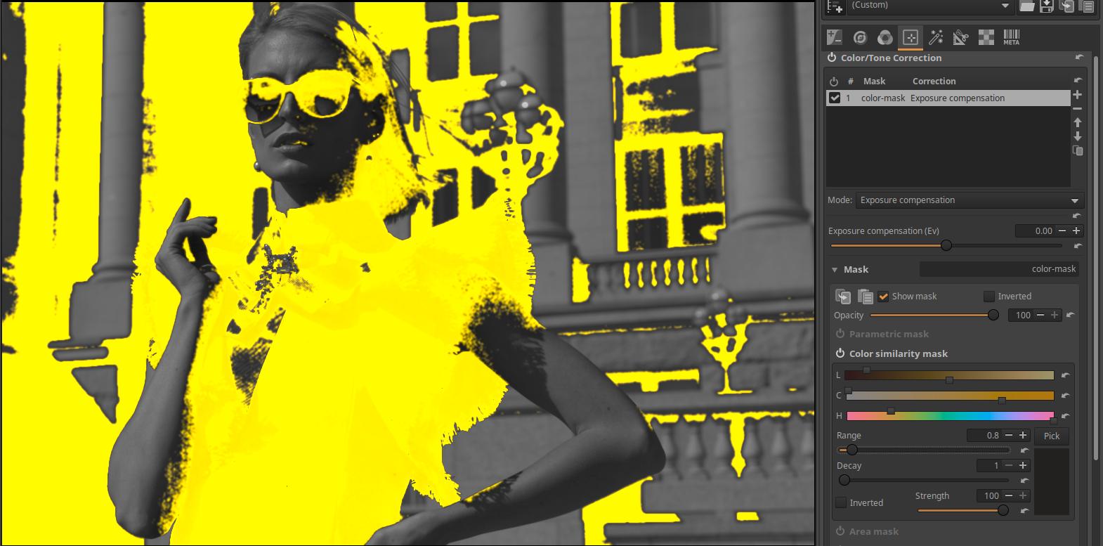 I opened an unedited raw file. In the Color/Tone Correction tool, I created a Color Similarity mask for the model’s dress, which I corrected with the Range slider.