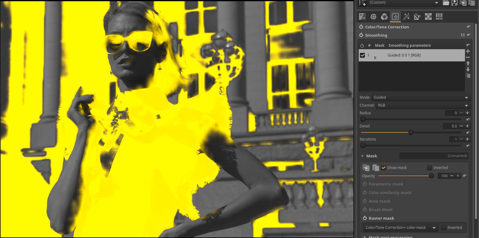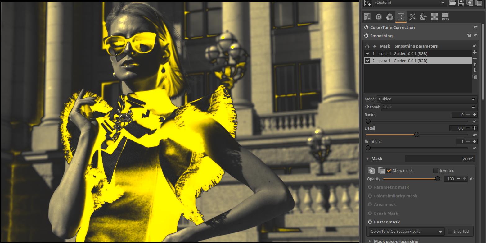 In the Smoothing tool, I linked the color and para masks from the Color/Tone correction tool, which were named color-1 and para-1. I link the color-1 and para-1 masks from the Smoothing tool to the other tools.