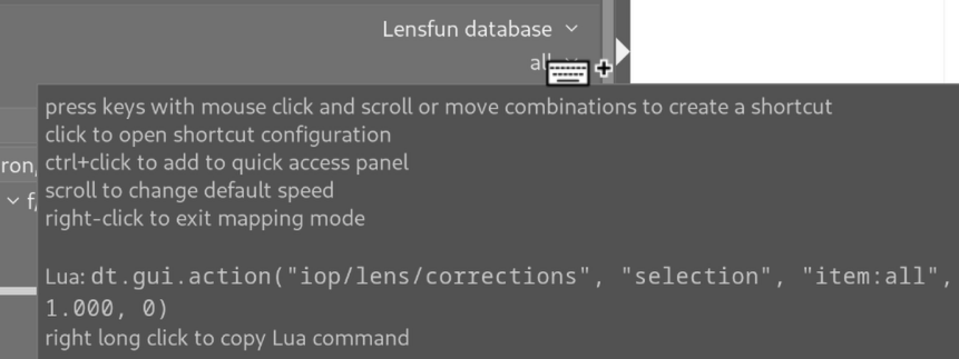 Hi @Mike_Bing , that’s a bit tricky: You can find most lua GuiActions using the darktable function “define keyboard shortcuts”. I couldn’t get that to work for the dropdown menu in the LensCorrection module. But: You’ve already given the right hint with “distortion & TCA”.