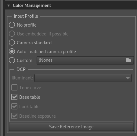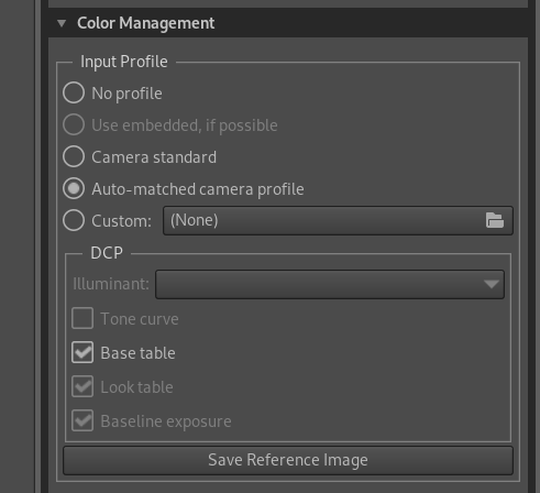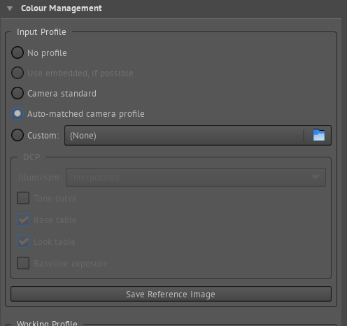 Selecting ‘camera standard’ and then back to ‘Auto-matched camera profile’ will make DCP options grayed out in GUI until selecting another raw file and going back.