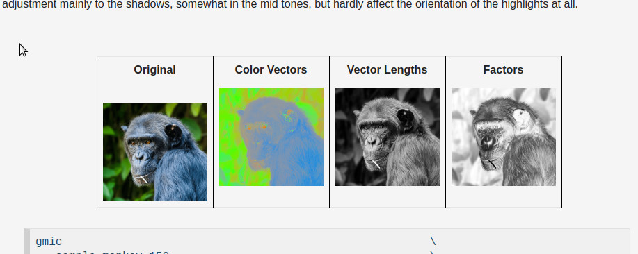 Distillation is always hard. Distillation is what happens from (2) to (1). David has made (3) trivial: just write the inclusion markdown for a command and you have exactly what gmic -h supplies. Perhaps write a few helpful notes after the inclusion. (2) arises from just playing/experimenting with the command. Seeing examples here at pixls.us/gmic is always useful. Everybody: please post more! Playing and experimenting is the fun part of tutorial experience. At its conclusion, it is a matter of choosing the best examples and writing those up. Then there is the gist of the command; (1). I save that to the last. I find that if I’ve played a lot during (2), (1) becomes easier to write.