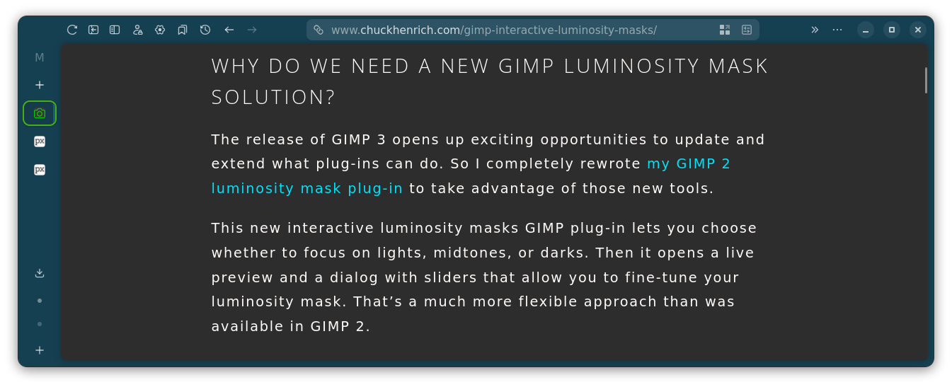 I’ve updated my luminosity masking plugin for GIMP 3. It’s a complete rewrite, and interactive. I approached the rewrite with simplicity, ease of use, and obviousness in mind.