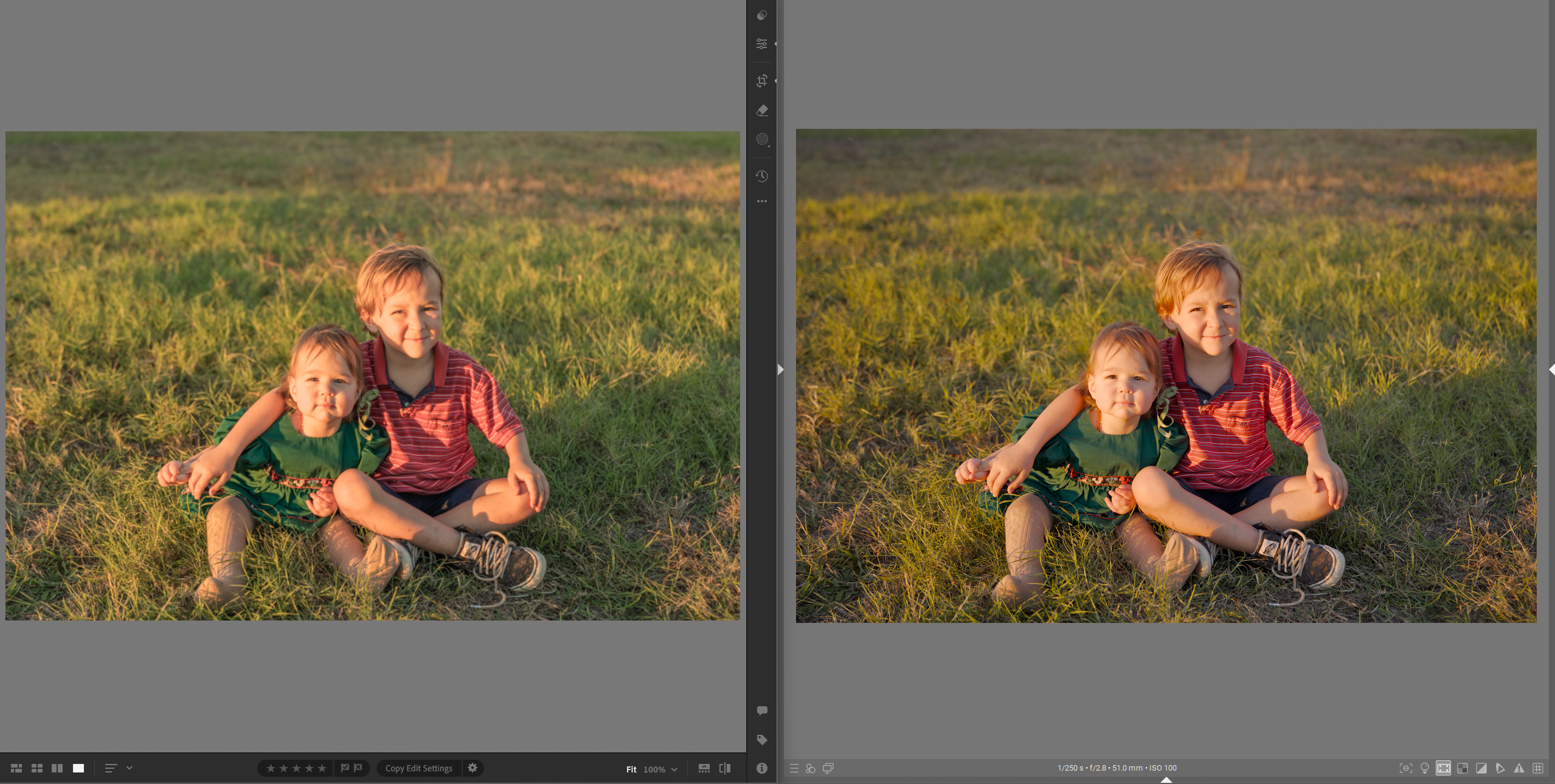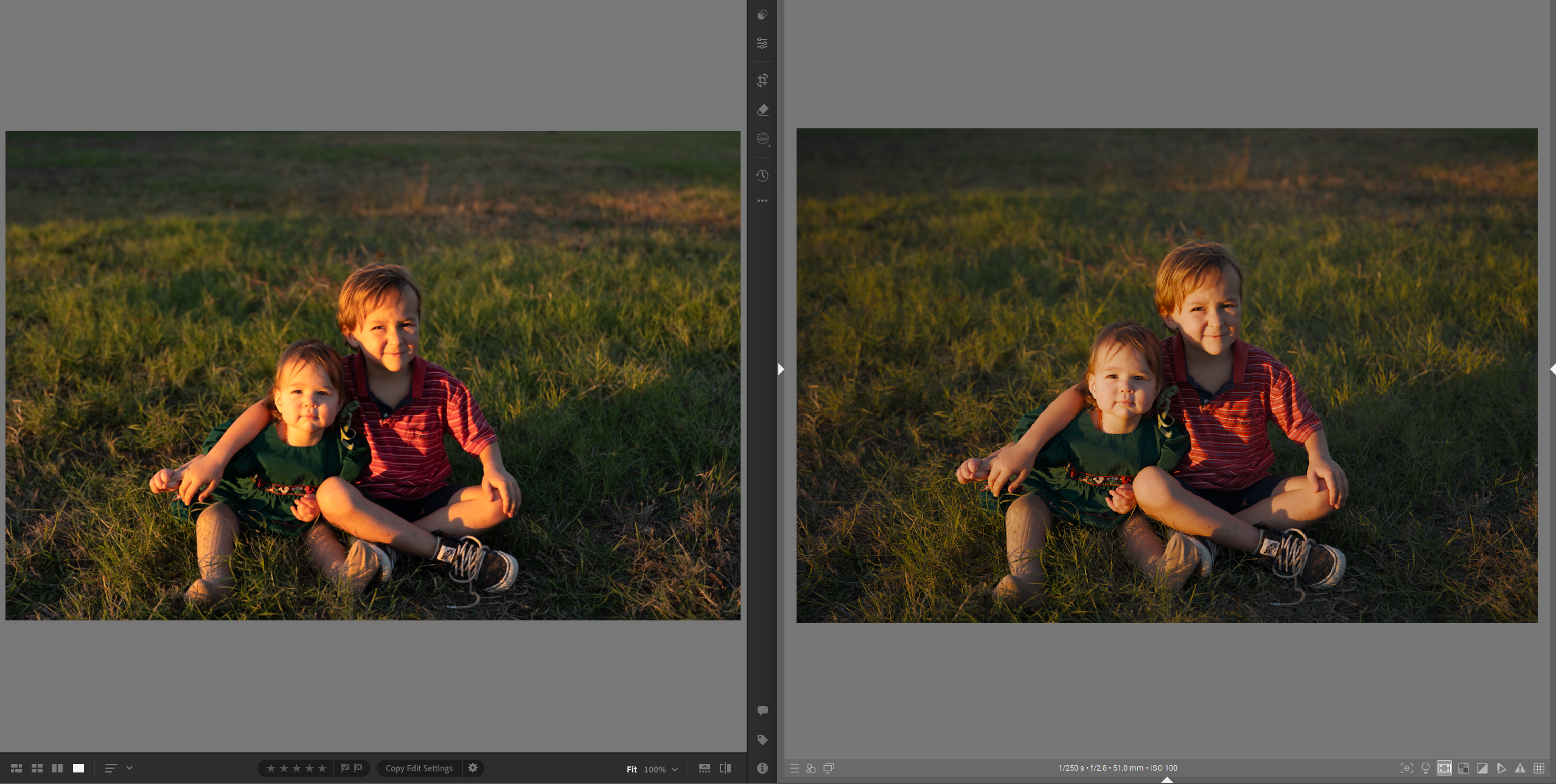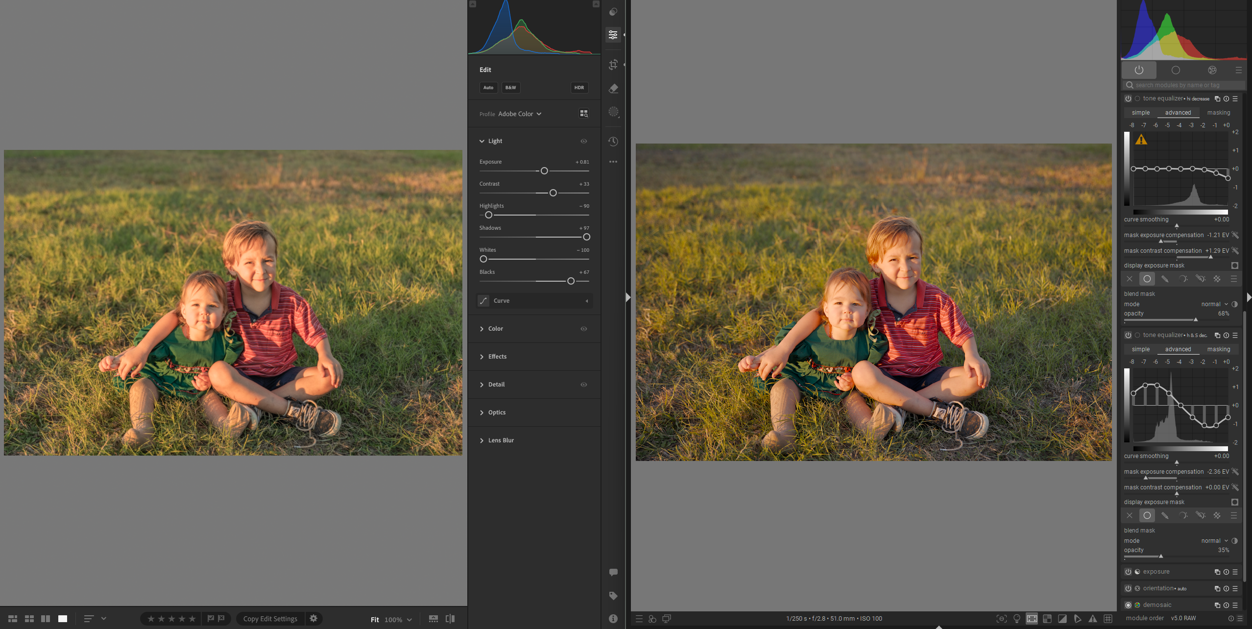 I included the original files in my post, in case you missed it, and there isn’t really an exposure problem (no clipping). The main “problem” with this photo is that it was taken near sunset, with the faces at a 90 degree angle to the light, which generally is not what you want to do. But kids are hard to photograph and you have to take opportunities when they arise