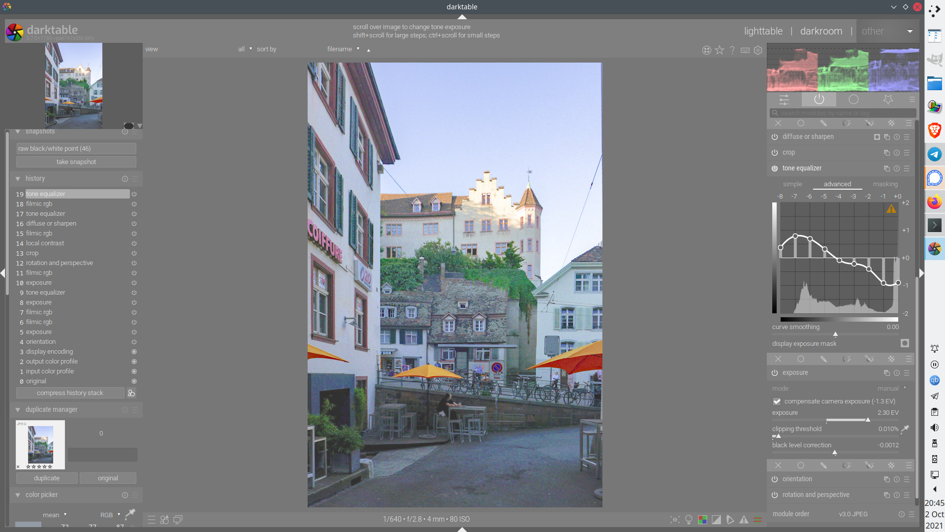 Note that this is using the āv3.0 JPEGā module order; the important part is having exposure and the other tools after input color profile in the pipeline, so it can undo the sRGB encoding (āgammaā - which it is not, and AP will kill me for using the g-word if he finds out).