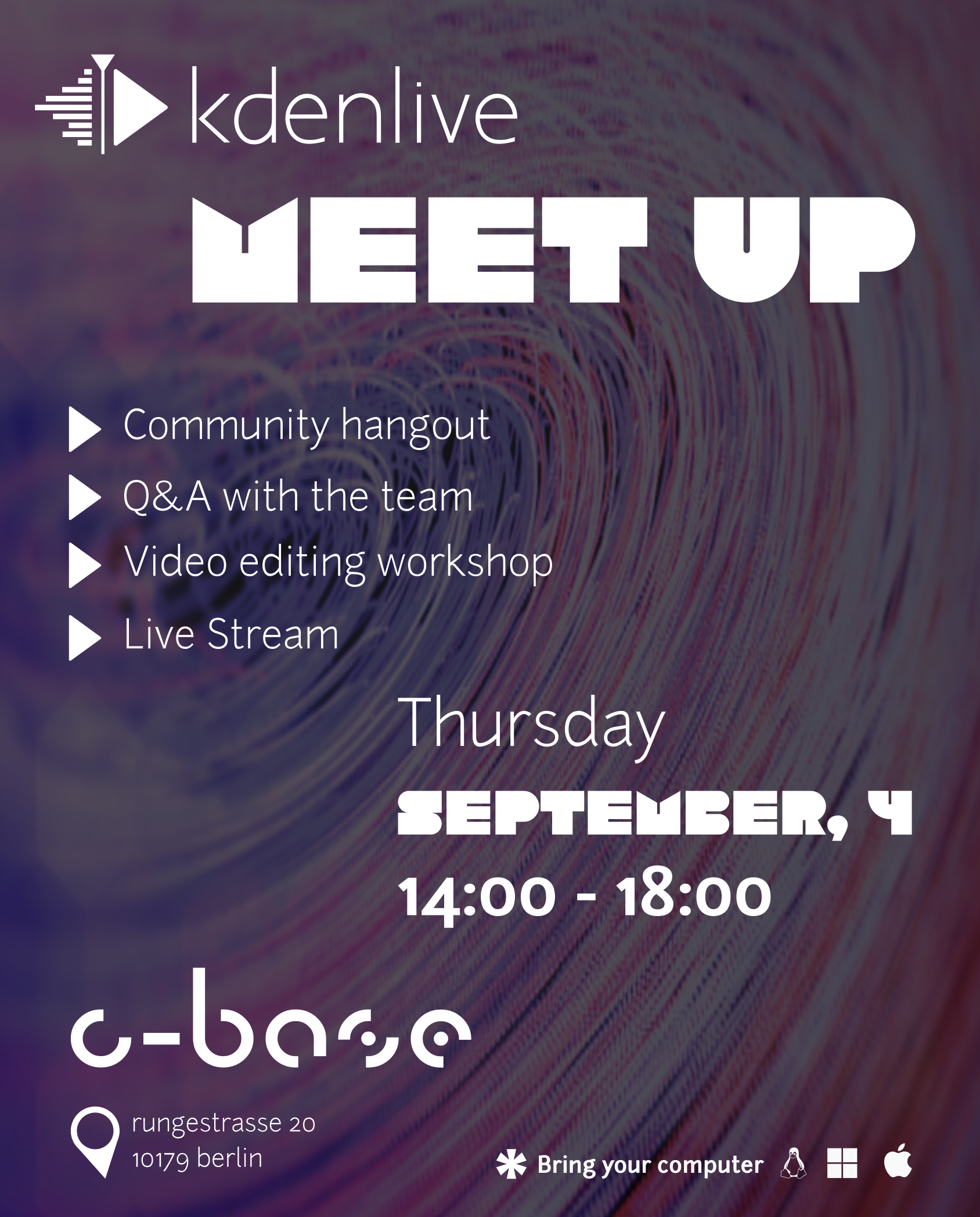 Join us on Thursday, September 4, 2025 at the c-base hackerspace for the Kdenlive meet up.