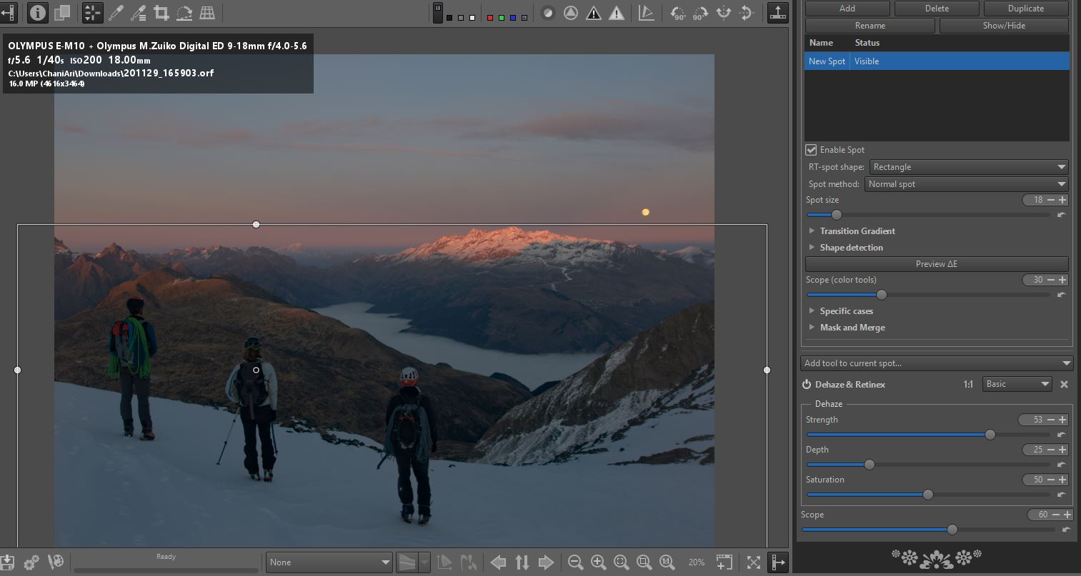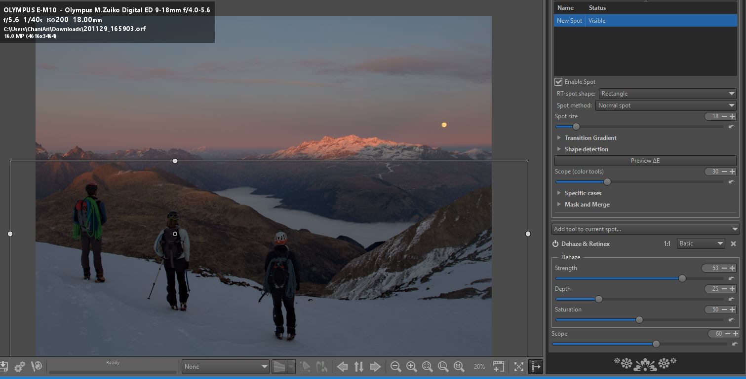 Using the raw file from Alpenglow panorama with climbers I was trying to dehaze the foreground and noticed that the color cast on the mountain around the center guy changed its color cast depending on the size of the local area chosen. In the 1st one, there is a much more pronounced red highlight. 201129_165903.orf dahze 1.pp3 (16.1 KB) 201129_165903.orf dahze 2.pp3 (16.1 KB)