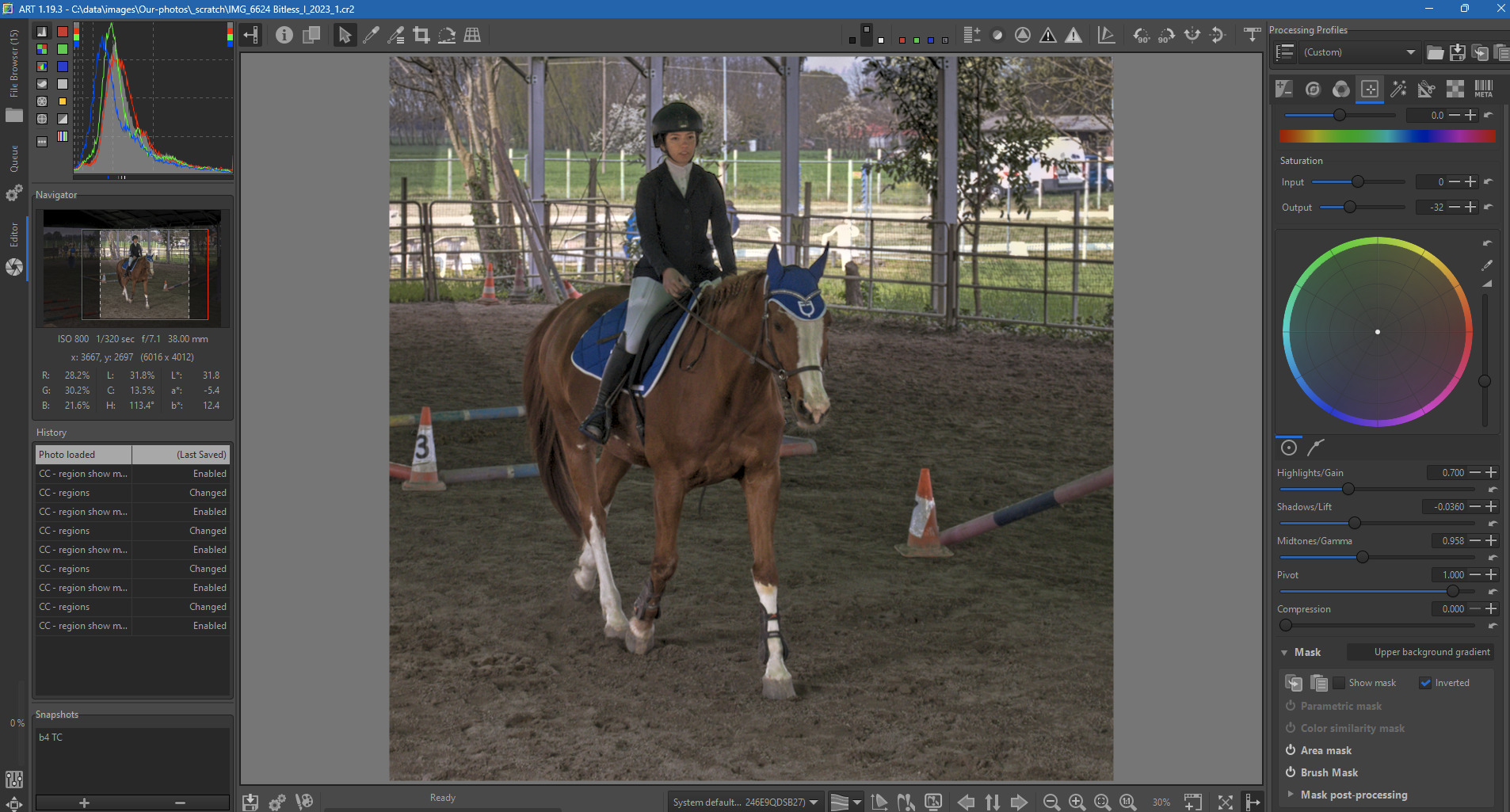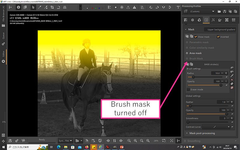 To brighten the horse a bit, I hand-painted a brush mask over it, feathered slightly and reduced opacity a bit. On another mask layer I copied / inverted the horse brush mask, then intersected a gradient at the top to reduce the background brightness. You can see there are no obvious big artifacts. I’m not claiming it’s perfect, mind you (and it may well not be an ideal technique) but there’s nothing “off”. There was likewise nothing wrong in the ART preview and the export looked good.