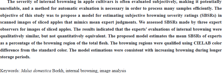 “Each fruit was sliced at the equator at a thickness of 1 cm, and the slice was captured by a flatbed image scanner (GT-X980, Seiko Epson Corp., Suwa, Nagano, Japan). The flatbed scanner is readily available and allows the easy acquisition of highly stable samples because its shooting environment (i.e., the configuration of light source, camera and scanning surface) is fixed within the same product. The cover of the scanner (the transparency unit) was removed to accommodate the fruit; thus, in order to eliminate external lighting, the fruit was covered by a black Bakelite board during scanning. The scanning resolution was 1200 dpi and the color depth was 16 bits per R/G/B component.”