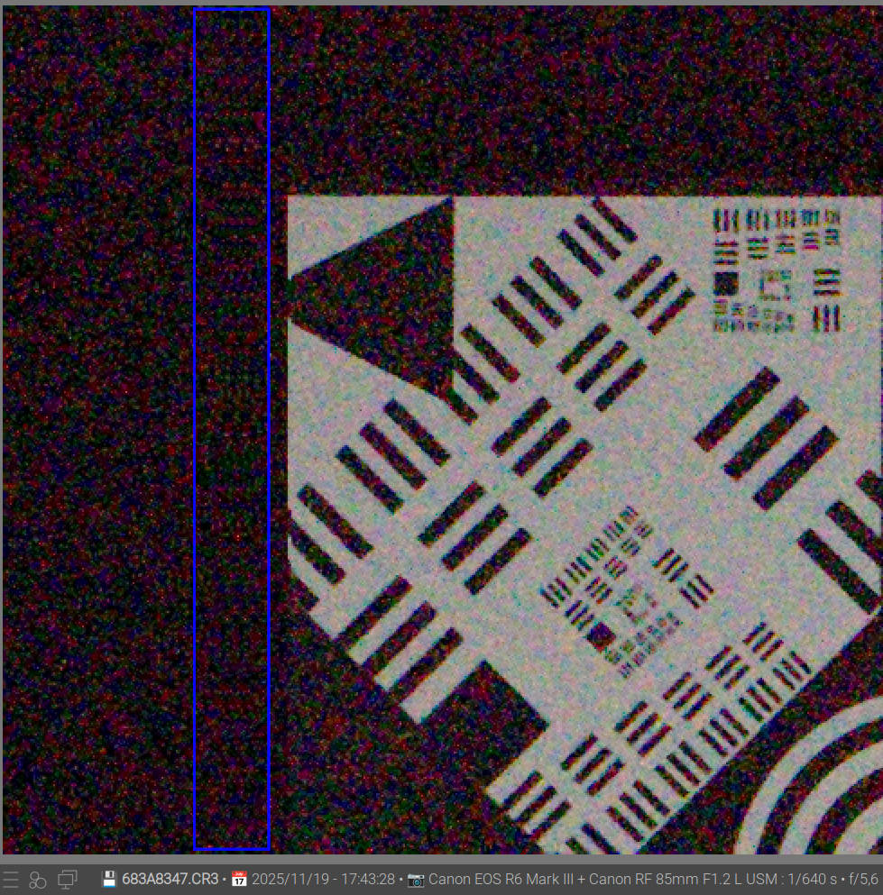 When checking the optical black area at ISO 1600, There is a brighter line 2 px down from the top. At line 10 there is a grey line and can’t be used for black level.