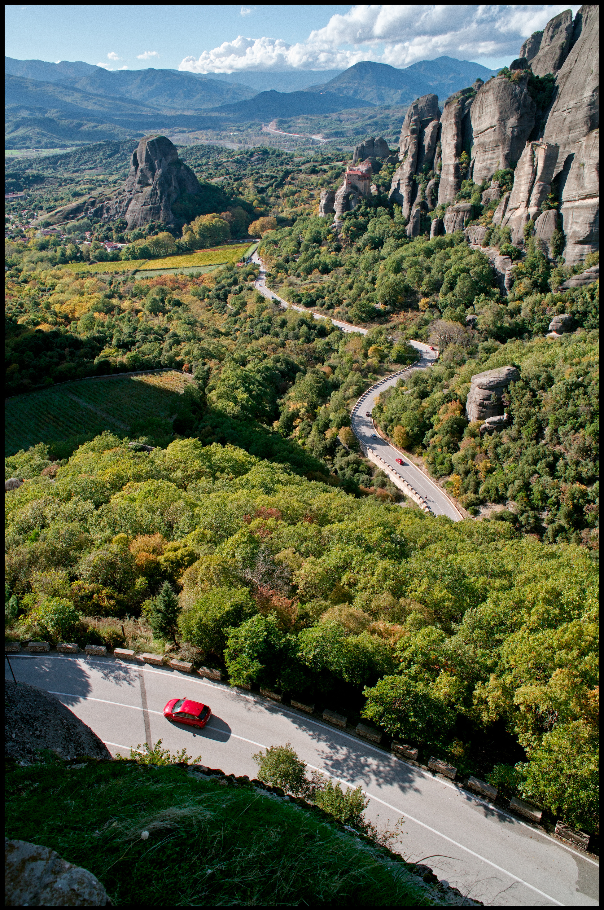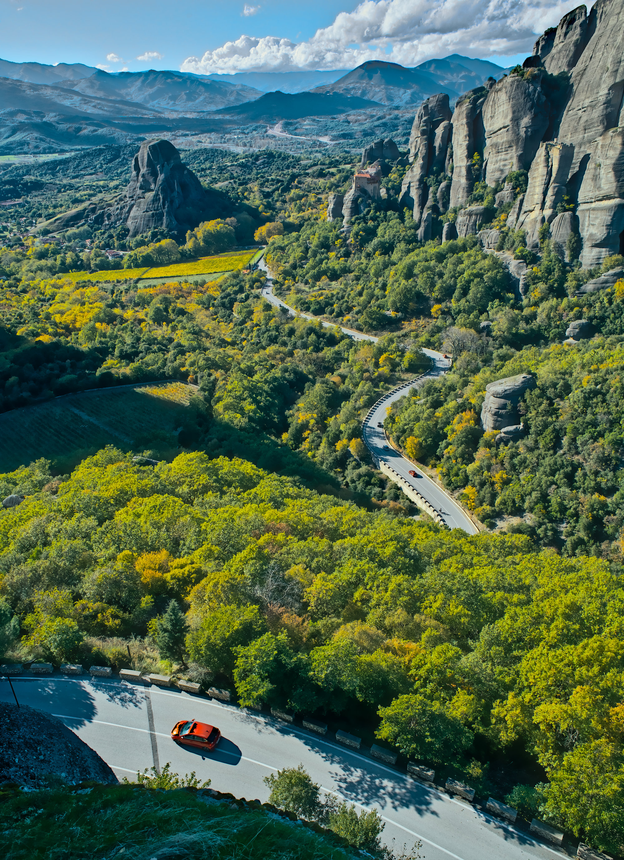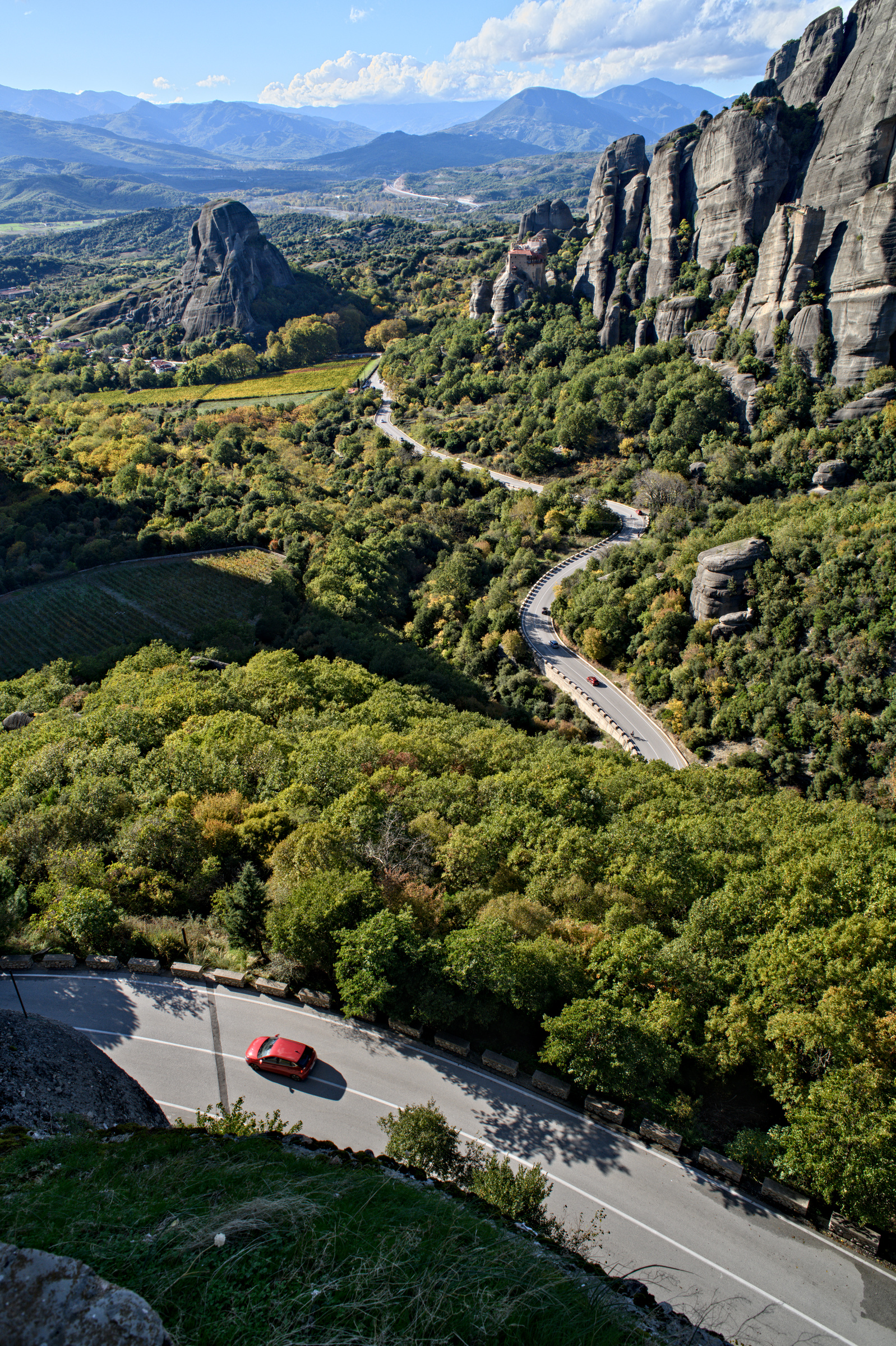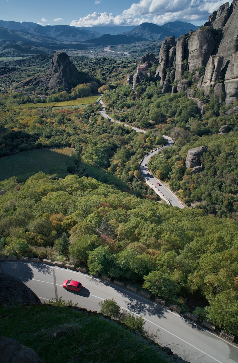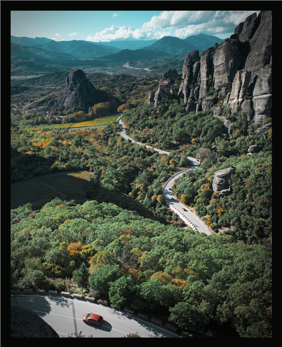 I Love the scale with the endless road leading into the beautiful mountains covered by clouds above and the rocks give such nice texture highlighting light. That little pop of red from the car adds a lot. Great composition!