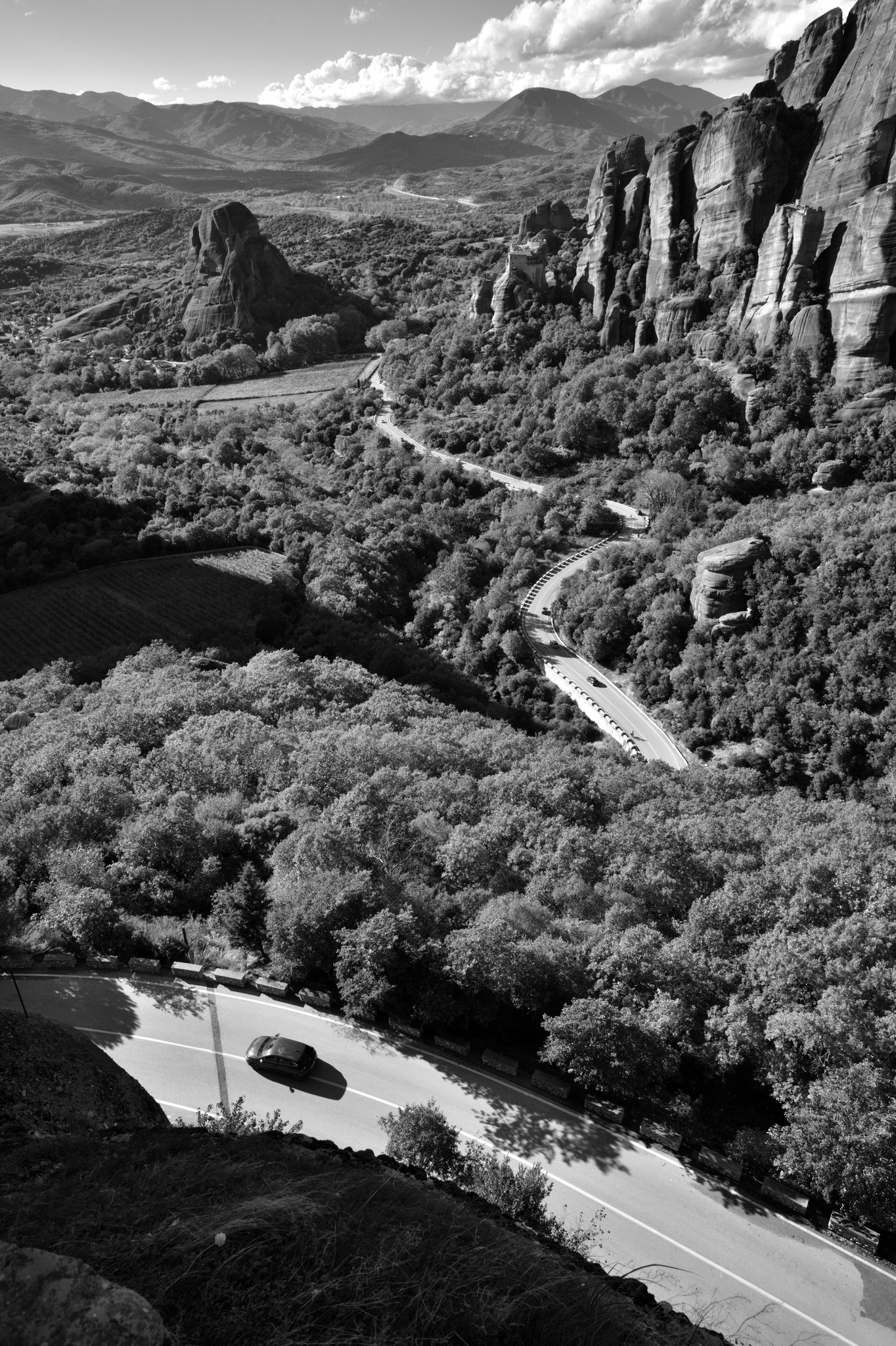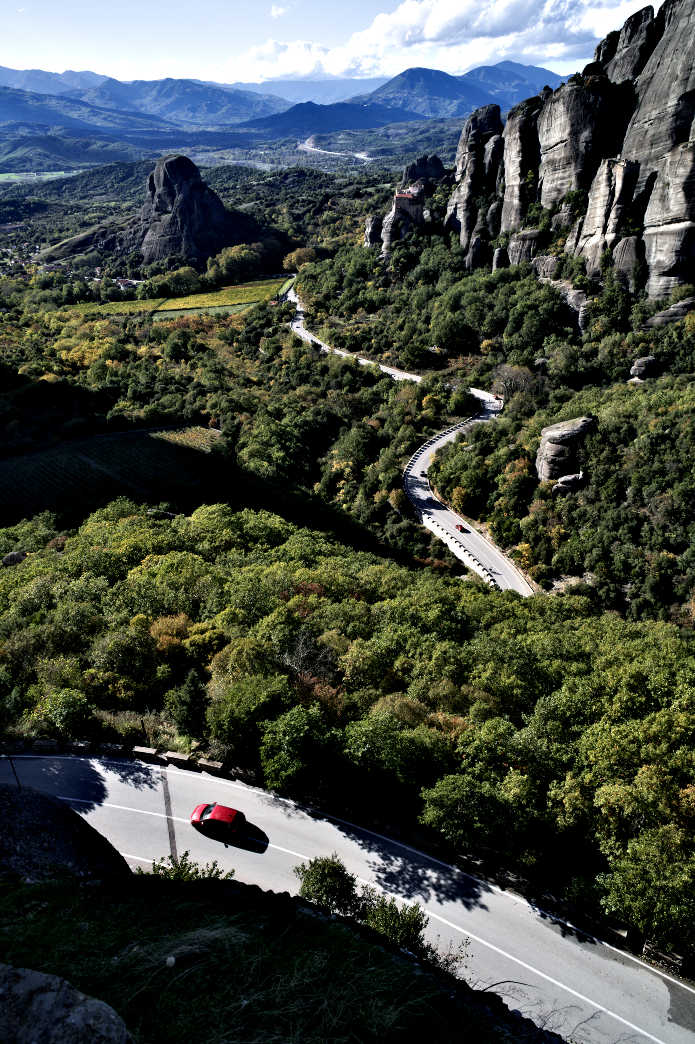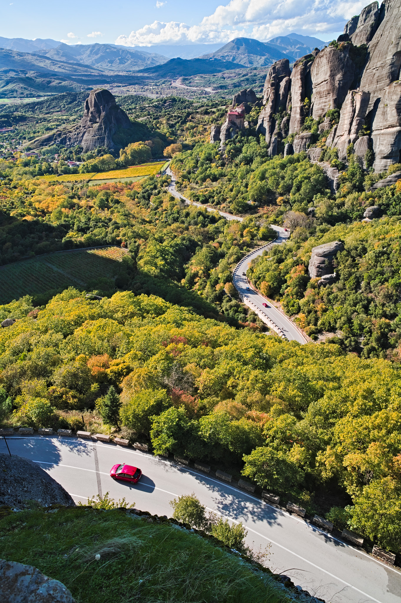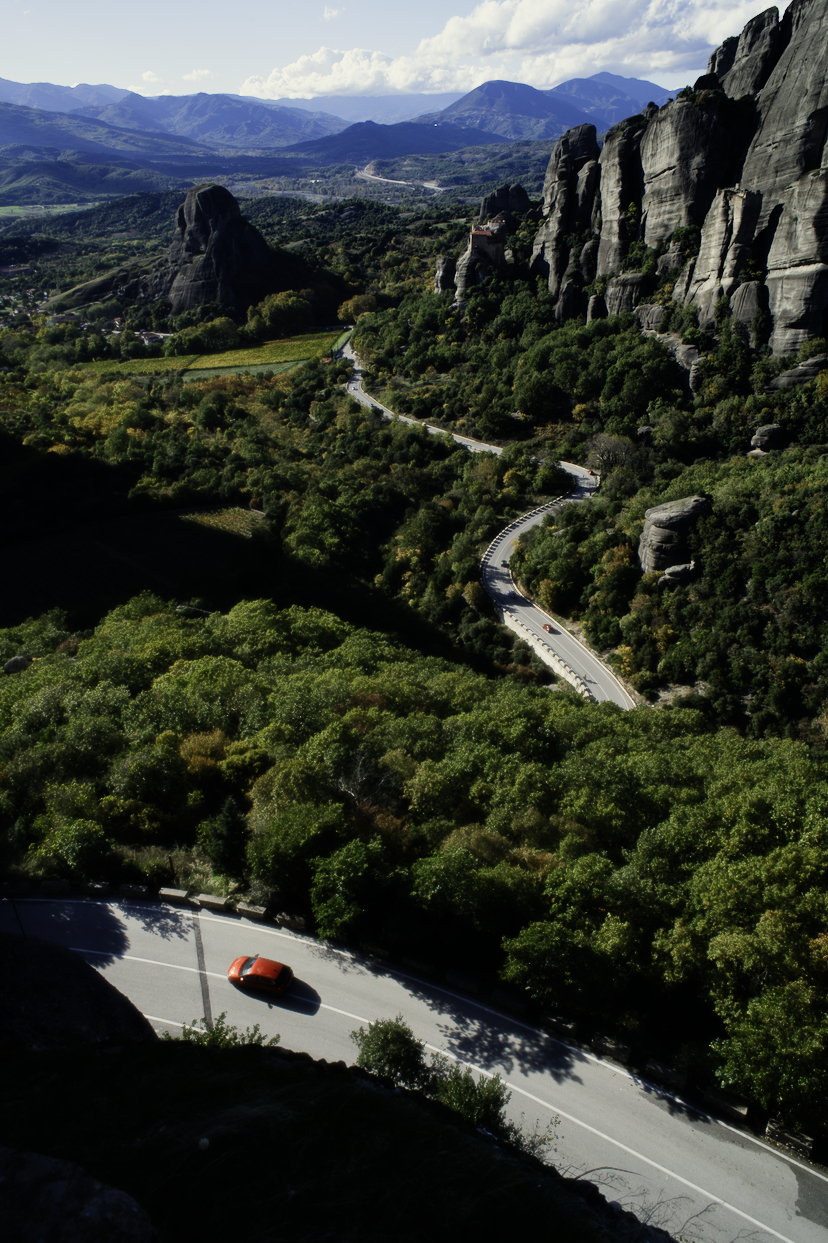 I Love the scale with the endless road leading into the beautiful mountains covered by clouds above and the rocks give such nice texture highlighting light. That little pop of red from the car adds a lot. Great composition!