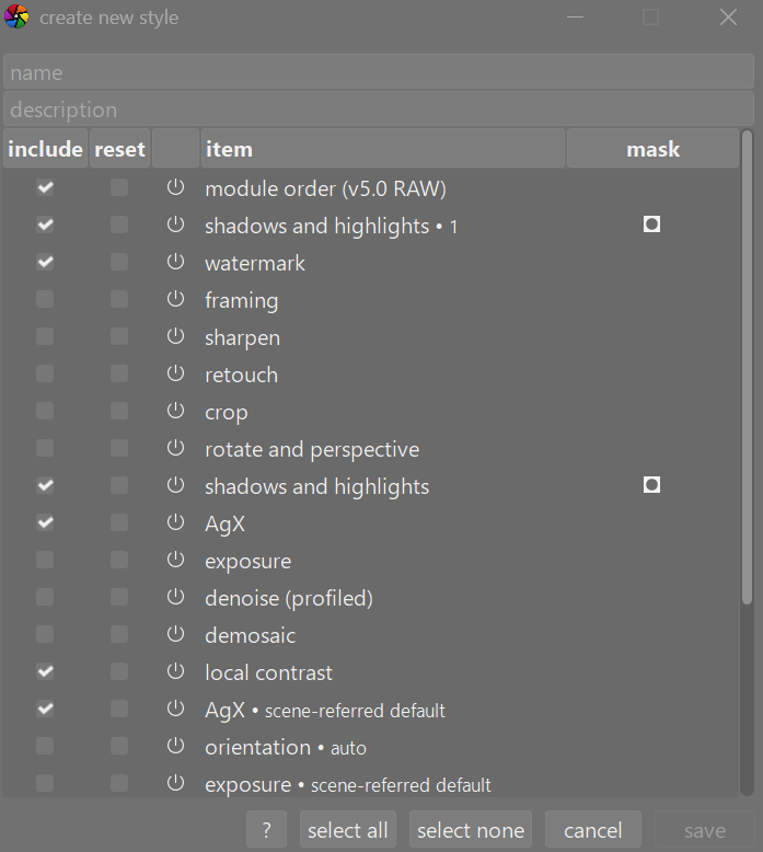 When you create a style you are given two options to include the module or to reset the module. If you choose to “reset” that module’s parameters – this will cause the module to be included in the style but with all controls set to their initial (default) state and this would usually be a good idea for modules such as lens correction which needs to adjust to specific lens settings in use. However, if the style includes a module that affects color or contrast then resetting that module would be a mistake. You want to copy that modules custom settings to be applied as part of the style.